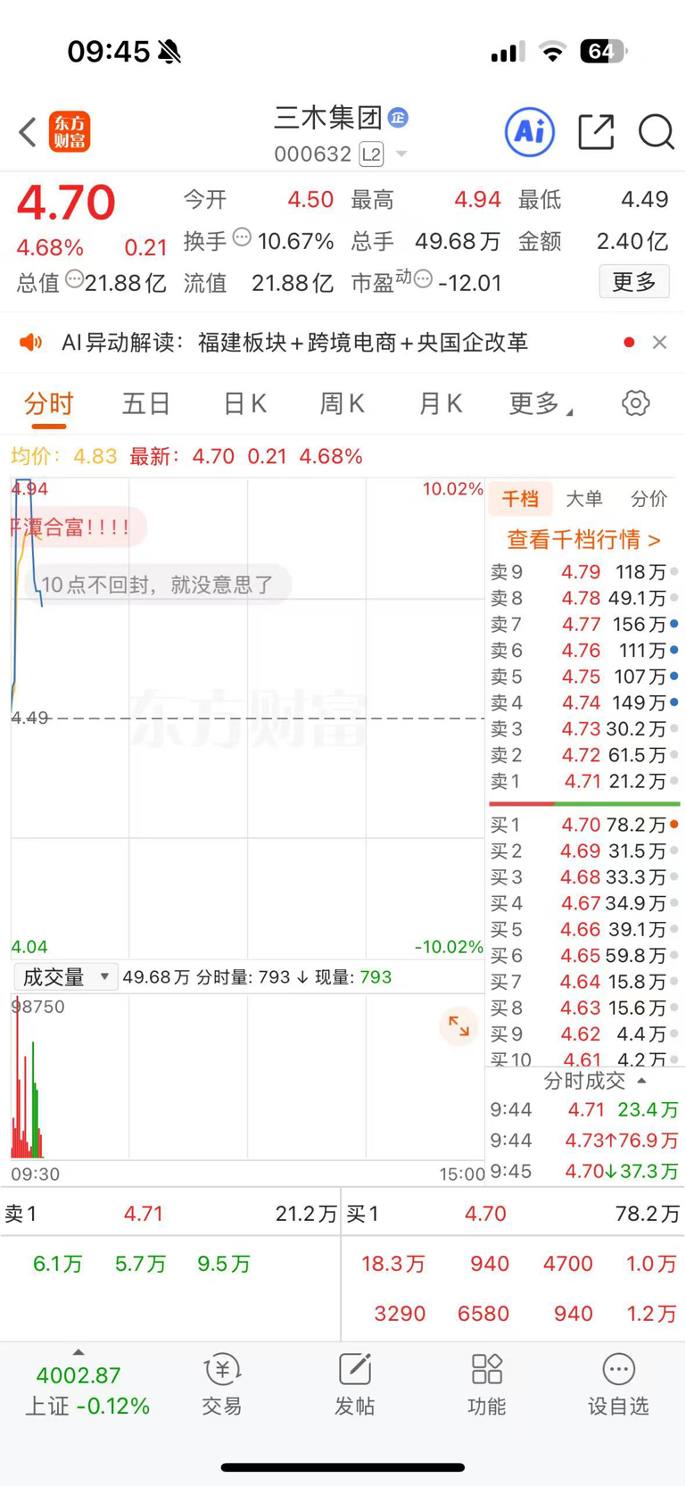 $三木集团(SZ000632)$ 周五三个多点犹豫了没进
