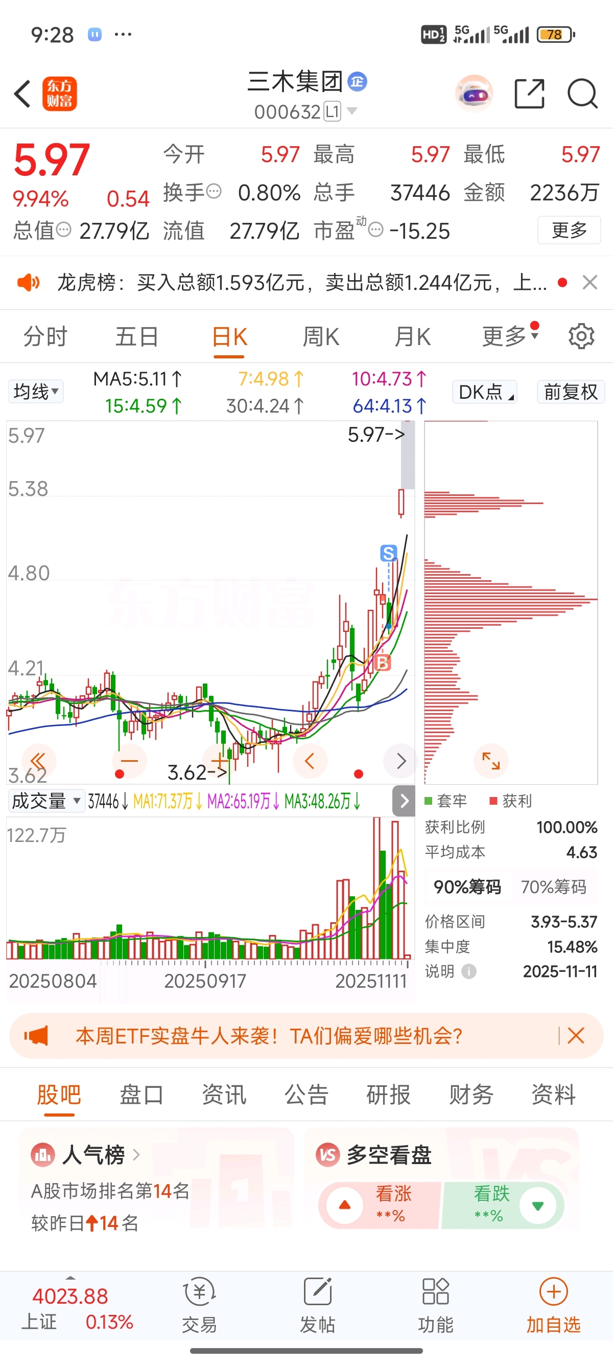 $三木集团(SZ000632)$ 当时买想着做平摊补涨,结果第二天下杀五个点无条件止损了,买早一天。还是没那个命。