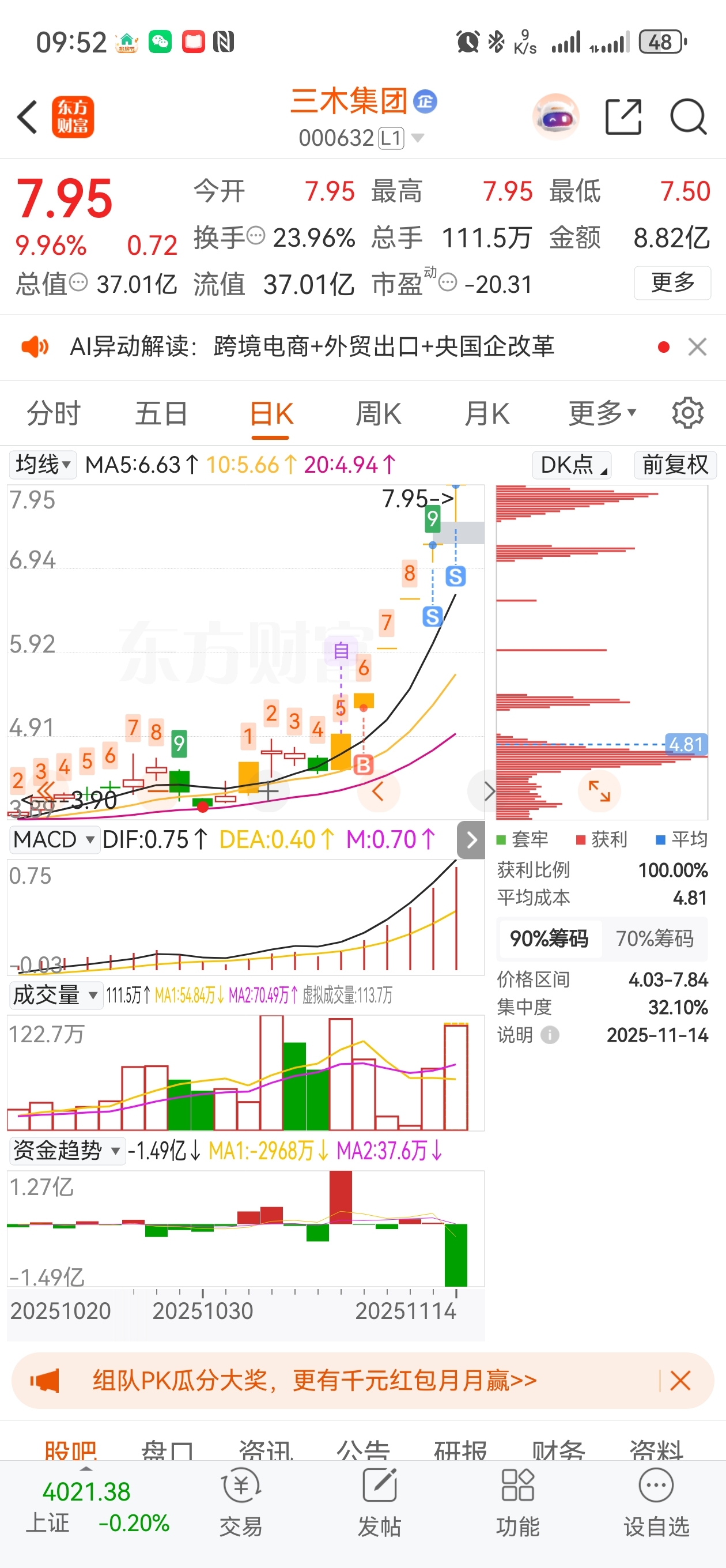 $三木集团(SZ000632)$ 剩了一手,留下的发财