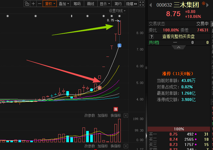 今天开盘没有预期的一字,意义已经有走弱的意向。虽然现在连板高标已经涨停,这个三木顺势拉升封板,但是我看今天或者明天短线见顶的概率非常高。所以今天我出来了。看到我帖子的或者关注我的人,都知道,我删除低吸和做连板。友情提示:高位放量,该走的主力都走了,短线不要再进了,该走就走吧。后面只有看戏,不做参与了!