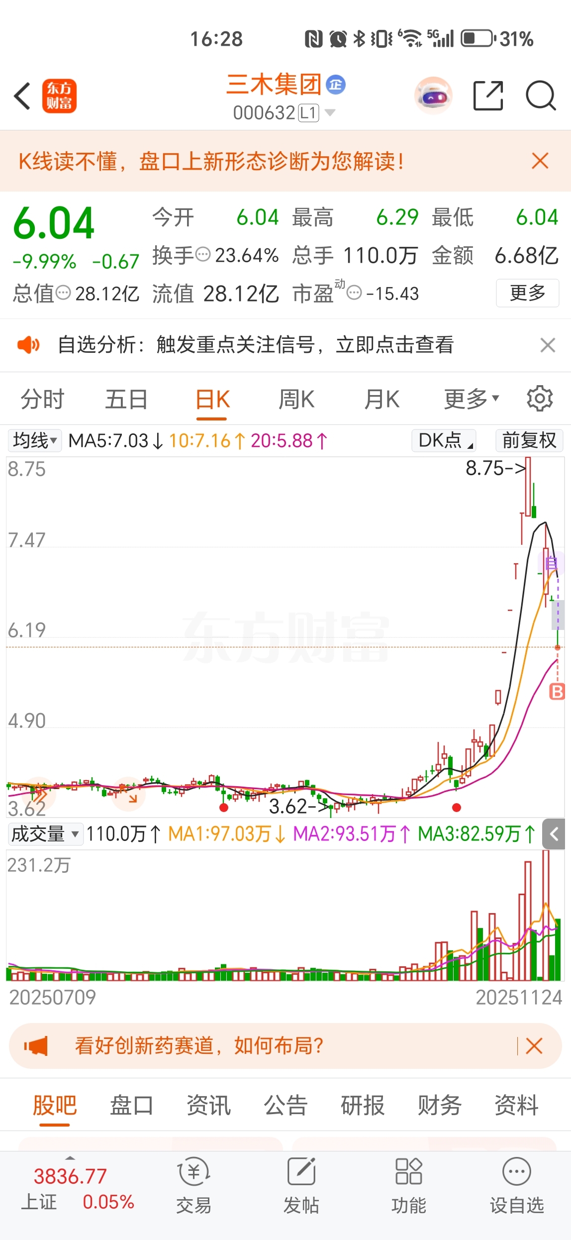 $三木集团(SZ000632)$ 大家不要惊慌,下跌倍量,证明快到底了,明天反包几率很大。
