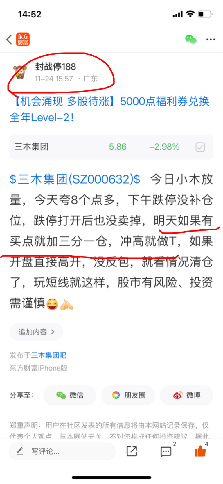 $三木集团(SZ000632)$ 小木今天继续放量,今天成功做T,成本降低0.62元,还夸2个多点,多余的分析就不说了,明天如大幅低开,又是加仓的好机会,反包就要看盘面考虑是否止盈,股市有风险,投资需谨慎