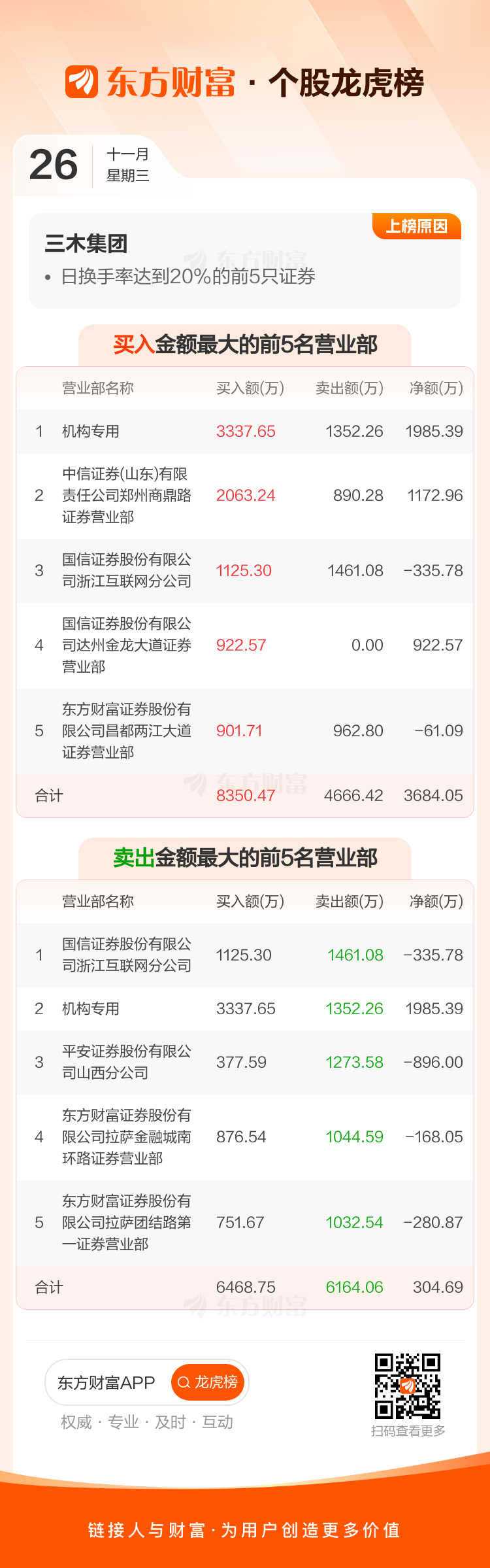 交易所2025年11月26日公布的交易公开信息显示,三木集团因成为日换手率达到20%的前5只证券上榜。三木集团当日收报6.19元,涨跌幅5.81%,偏离值35.49%,换手率35.49%,成交额9.82亿。