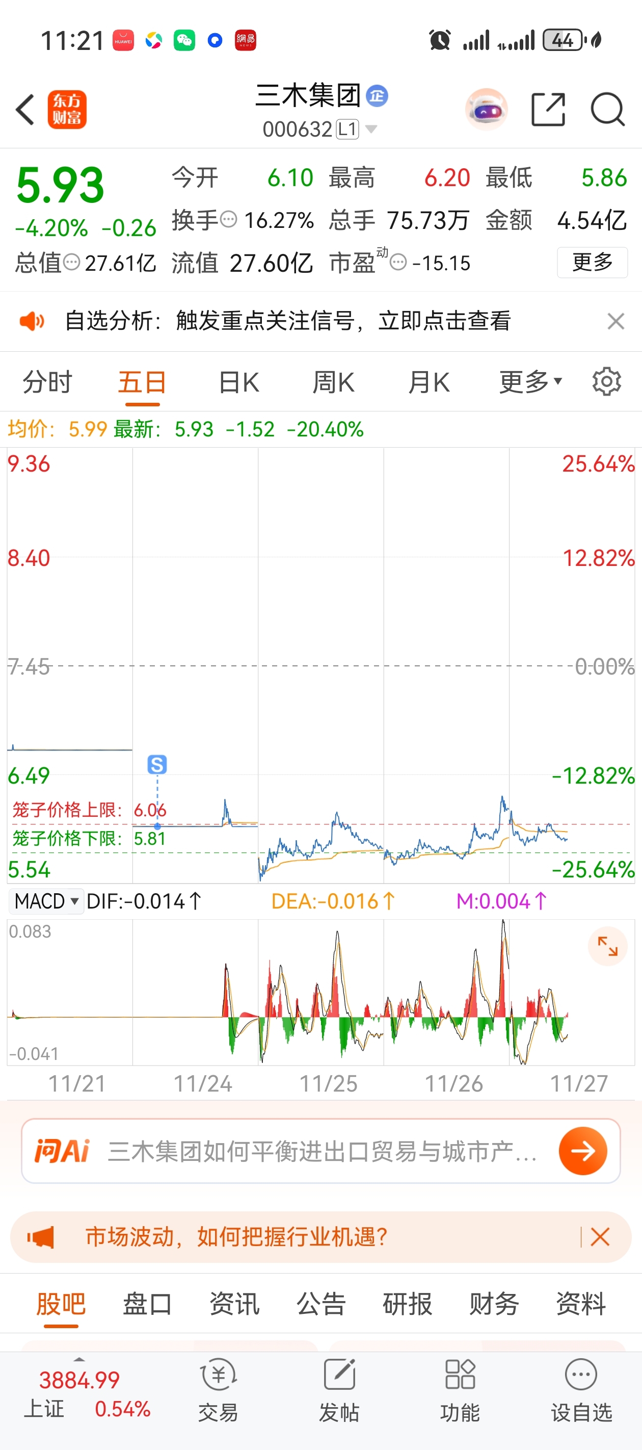 $三木集团(SZ000632)$ 这个货亏了我28个点,面上出了,回头看还是这个德行