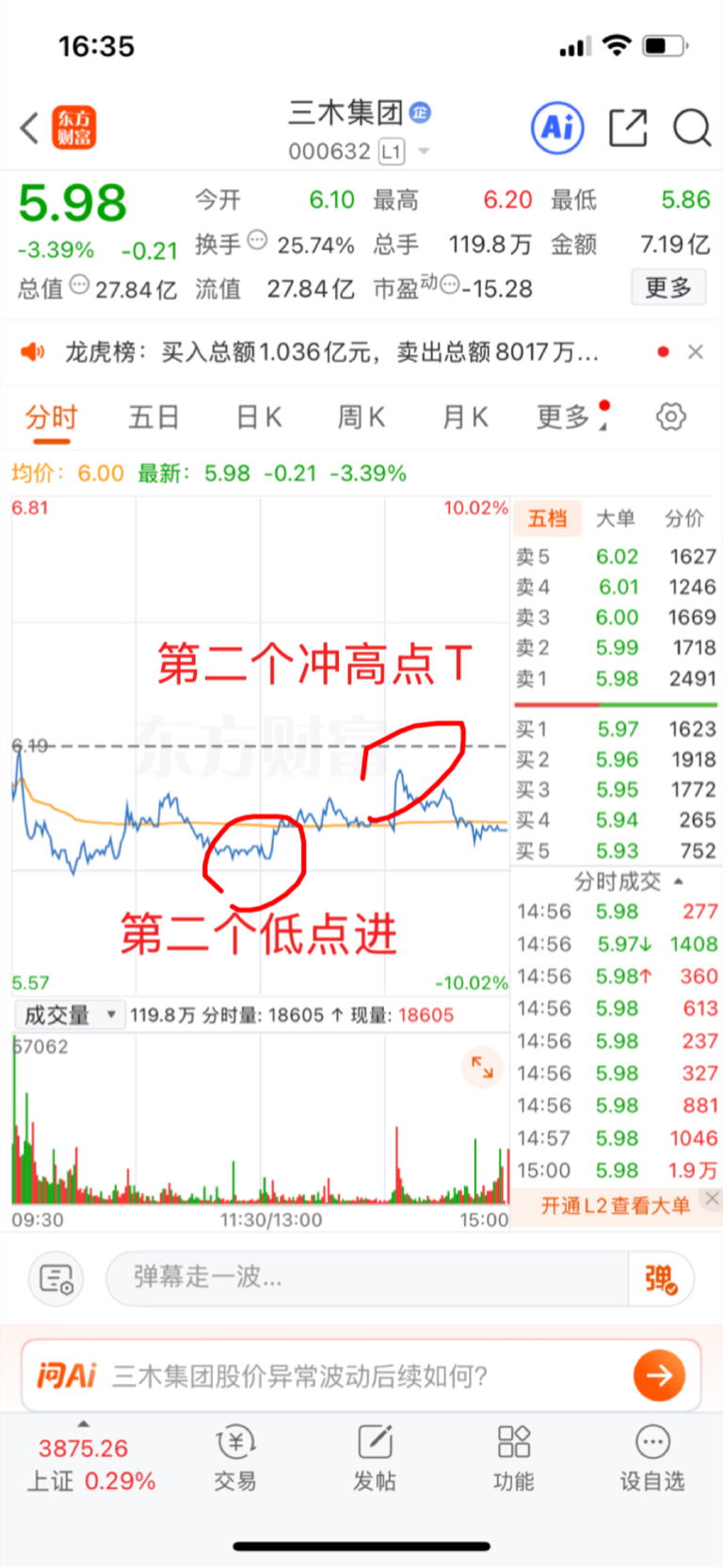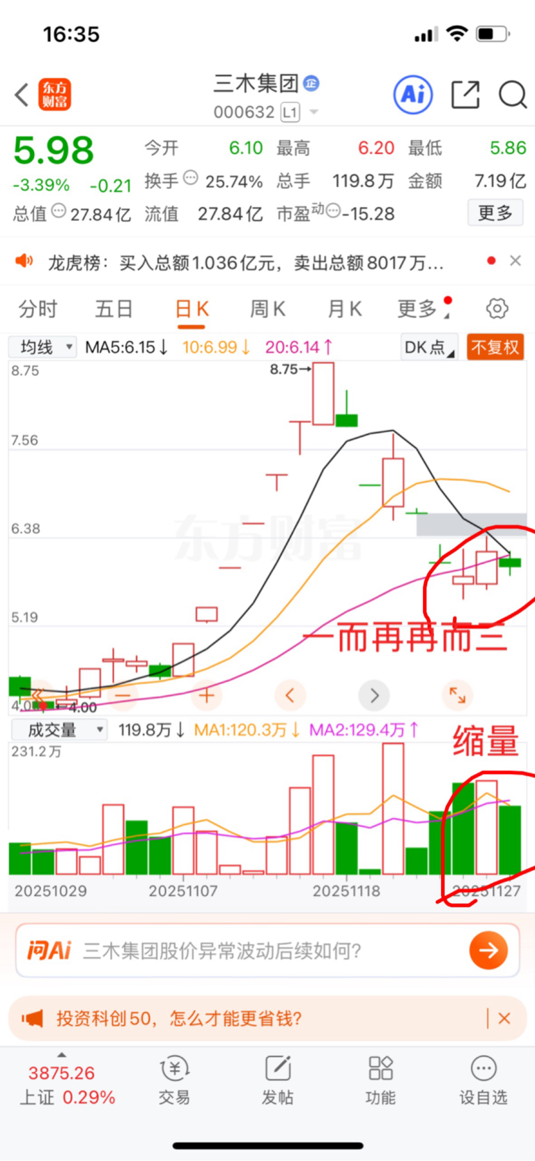 $三木集团(SZ000632)$ 小木今日之复盘:小木今天缩量下跌,其他分析不再多说,今天按计划继续成功做T,但尾盘同样没加大仓位,一而再再而三没能反包,明天如果低开,根据封战停法,开盘有机会就止盈,暂盈利17个点多(最好冲得高高的),股市有风险,投资需谨慎