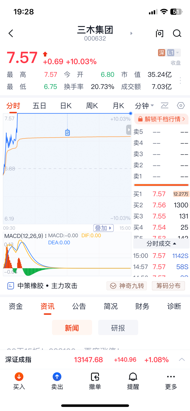 $三木集团(SZ000632)$ 涨停卖了,等着炸板也没发生,今后再有十个涨停也和我无关了。祝愿留下股友的发财。