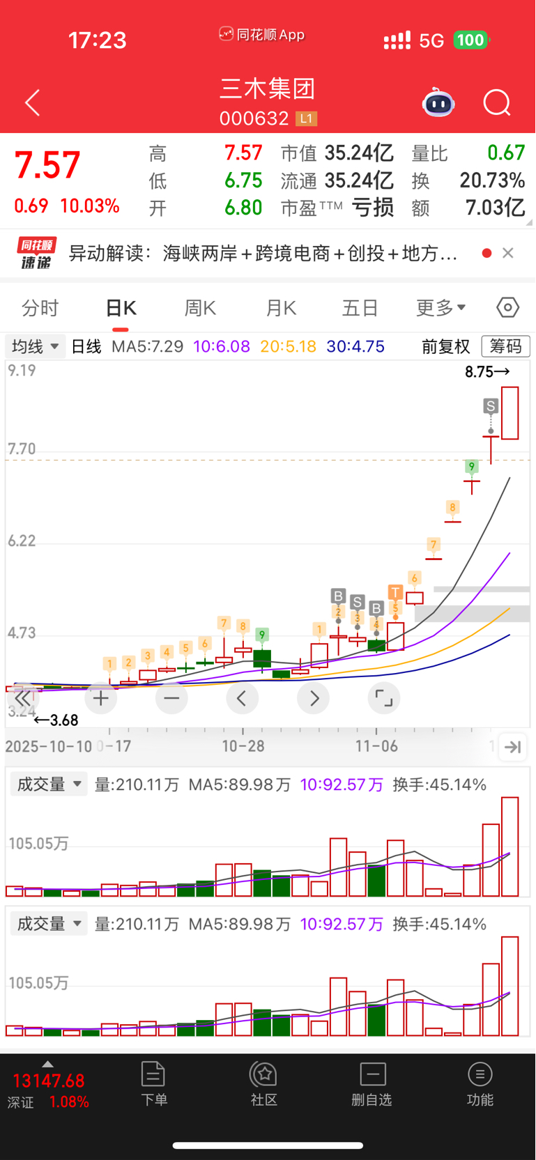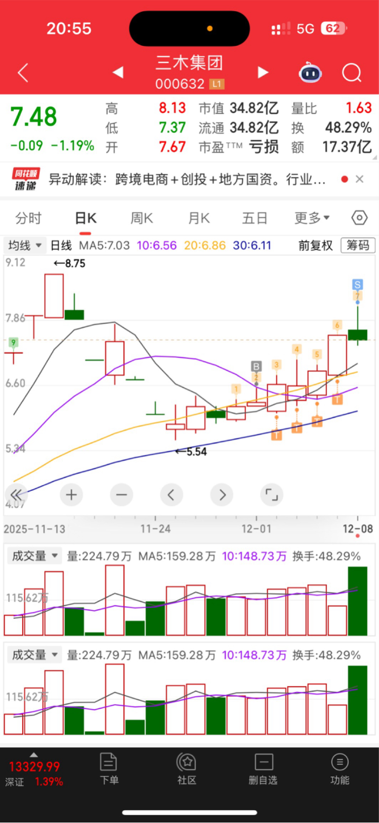 $三木集团(SZ000632)$ 今天全部出光,高点7.89出#实盘记录# #收盘点评# 洗洗更健康,过几天继续