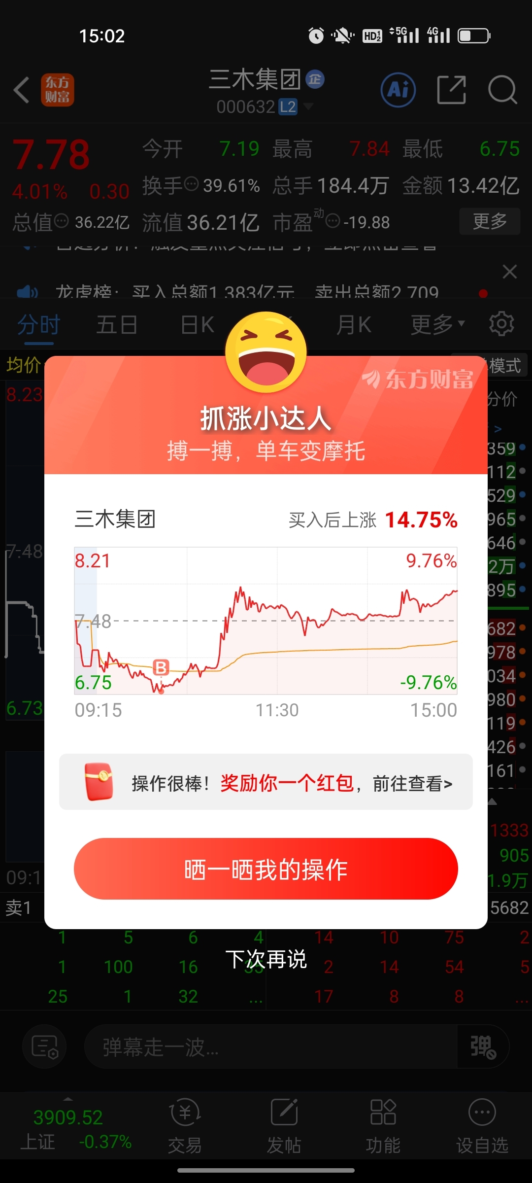 $三木集团(SZ000632)$ 上午下跌后就是不触及跌停价,看了卖盘量能不大,果断入场,入场后担心今天会涨停,收盘后看着涨幅还好没涨停。