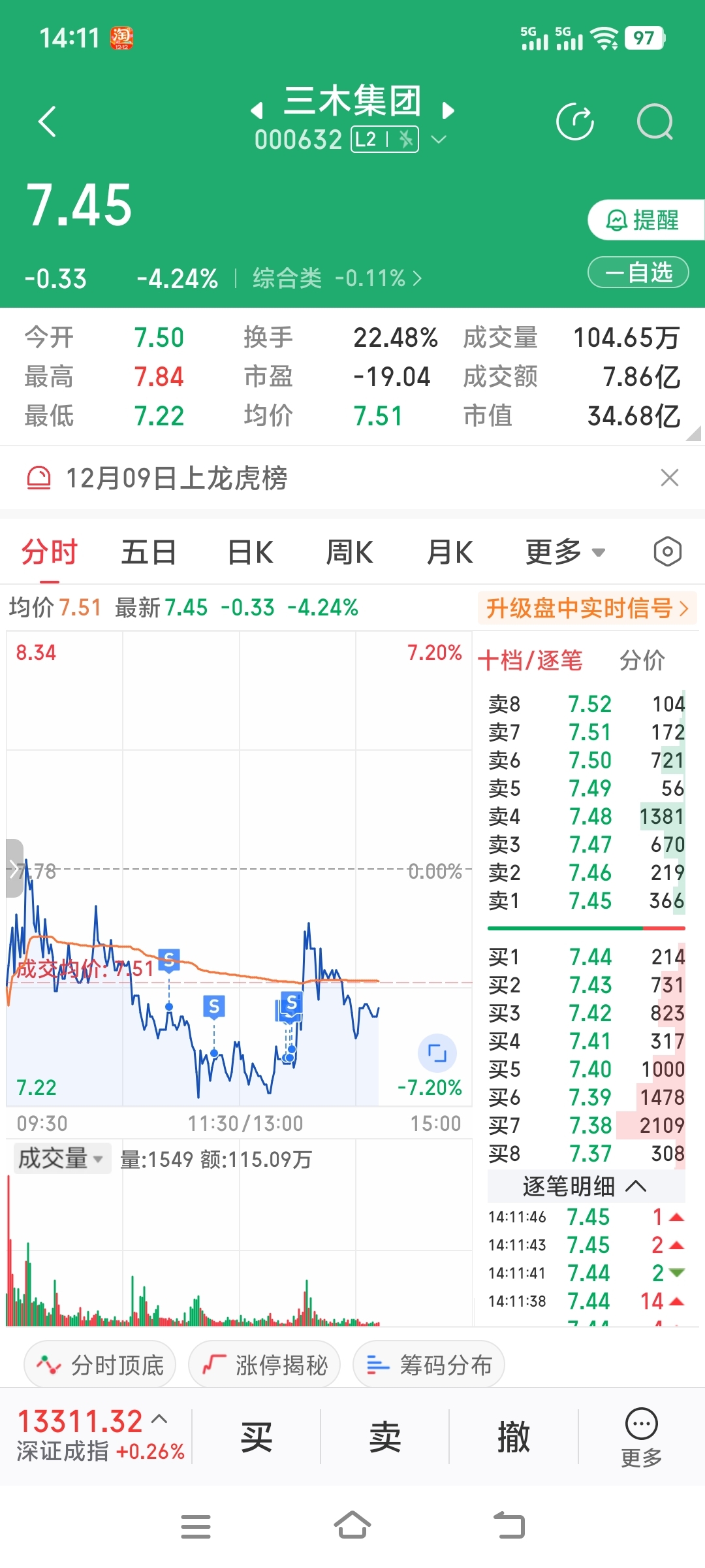 $三木集团(SZ000632)$ 我不卖,它不涨,后悔早上没卖掉它,买海马