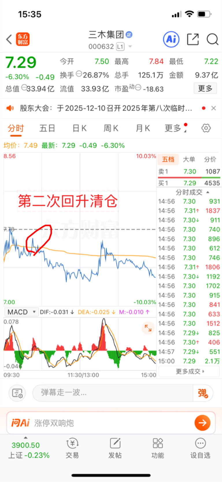 $三木集团(SZ000632)$ 今天大盘指数在上下震荡,小木量能有点减少,走势不及预期,7.68清仓,尾盘没补回仓位,明天起一段时间不再对小木进行关注,股市有风险,投资需谨慎,