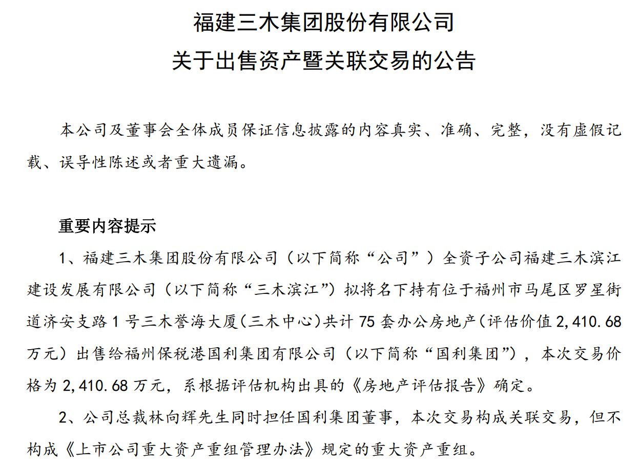 据三木集团公告,其全资子公司福建三木滨江建设发展有限公司(以下简称“三木滨江”)拟将其名下的办公房产出售。