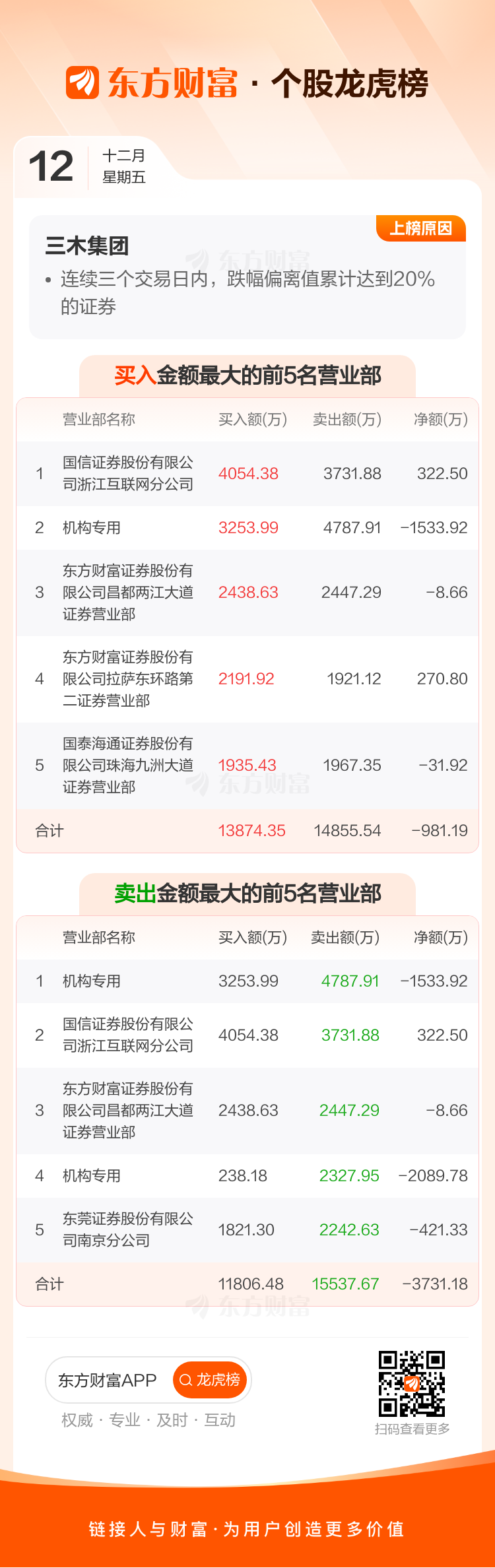 交易所2025年12月12日公布的交易公开信息显示,三木集团因成为连续三个交易日内,跌幅偏离值累计达到20%的证券上榜。三木集团当日收报6.11元,涨跌幅-6.86%,换手率20.00%,成交额5.90亿。异常期间12月10日至12月12日,期间涨幅-21.47%,累计偏离值-20.96%,区间成交额22.40亿。