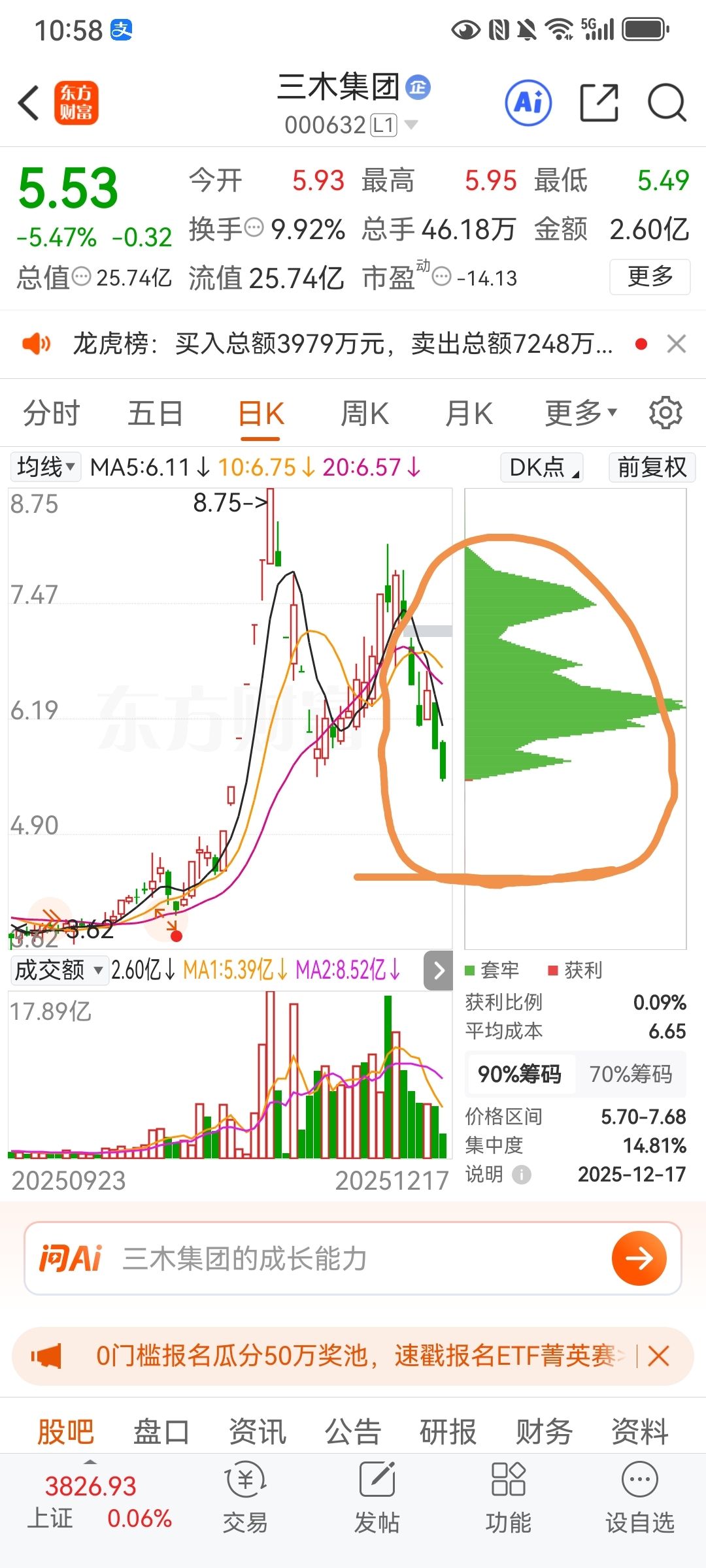 $三木集团(SZ000632)$ 筹码峰全是绿油油的,不亖才怪,这个星期都是跌的。