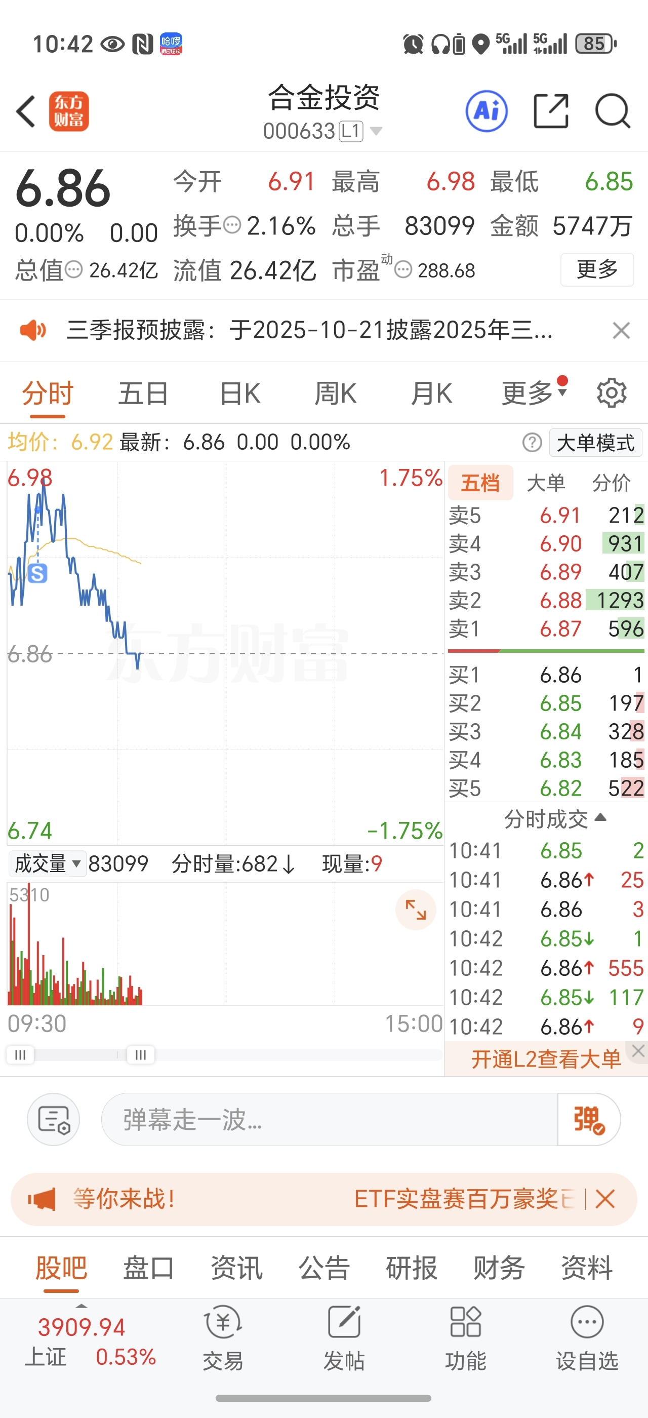 $合金投资(SZ000633)$ 见好就收,昨天早上6.49加的,早上6.95先跑了