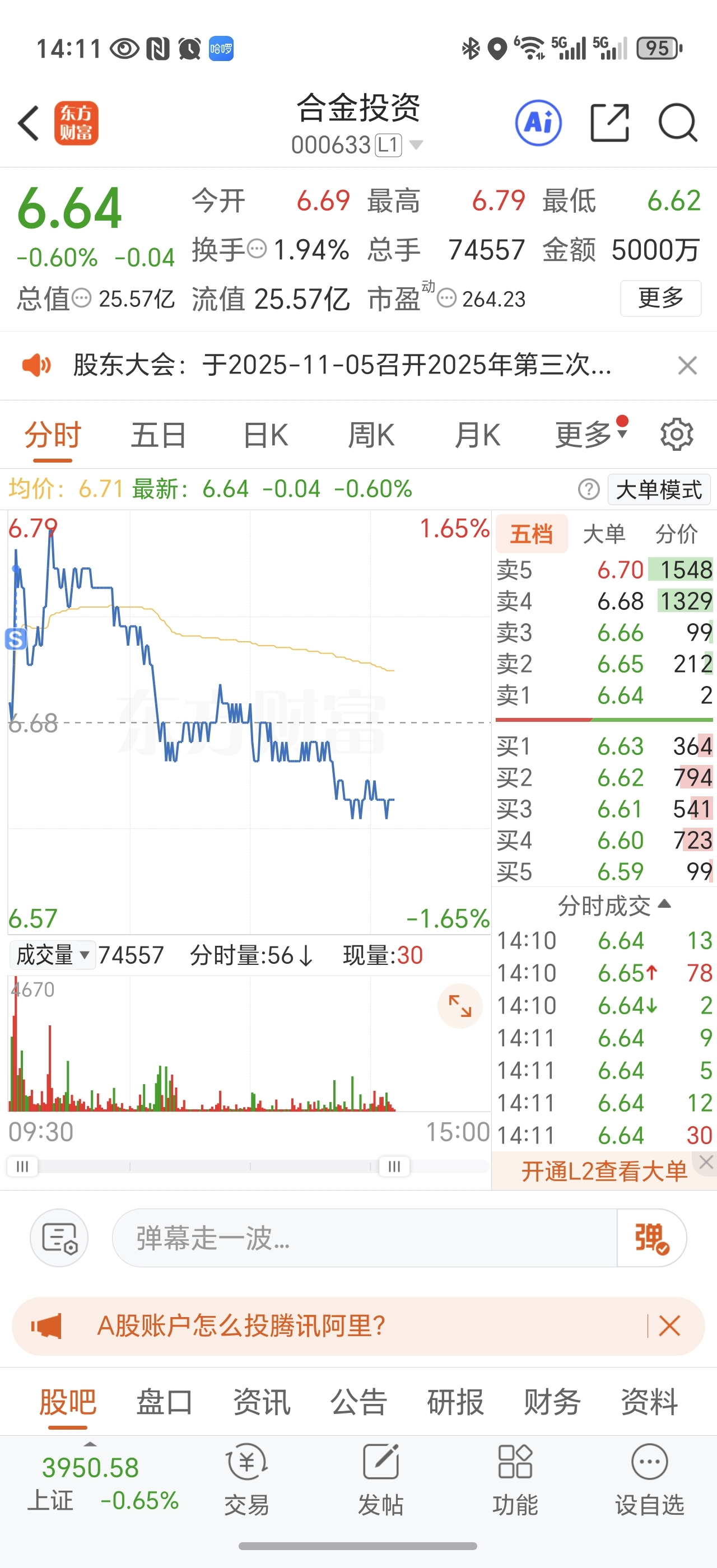 $合金投资(SZ000633)$ 还好一早跑了一半,到6.60我就接