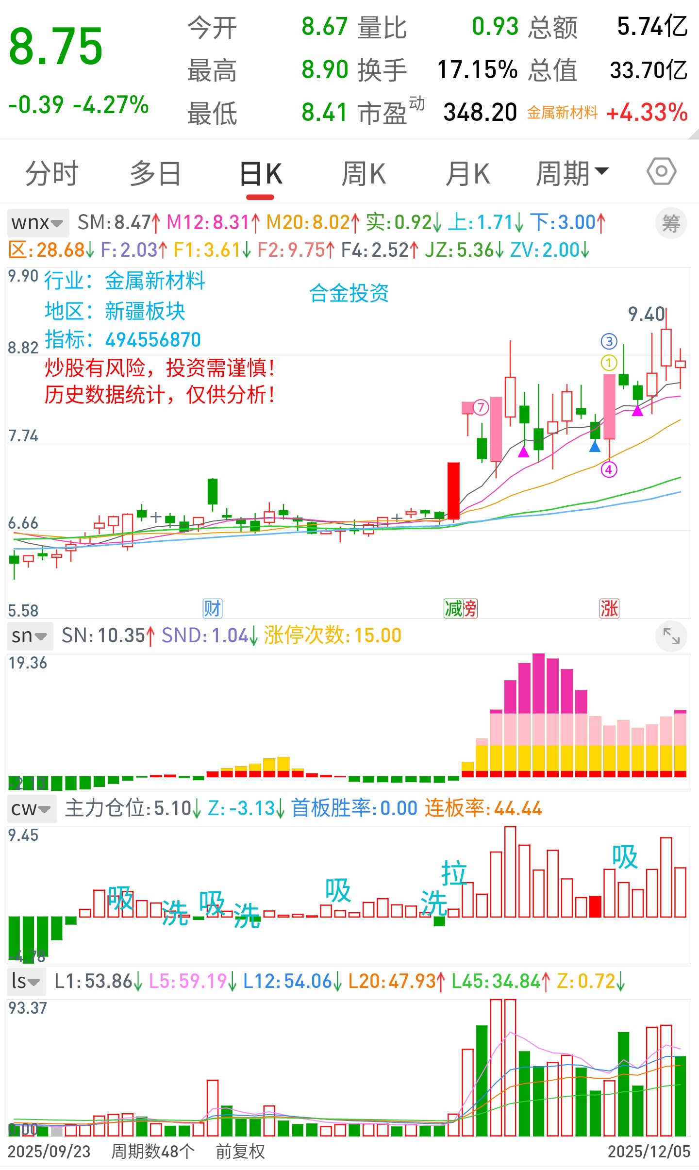 指标上看,sn开始反转向上,势能还不错,cw大幅向下减少,主力有资金撤出,注意风险。缩量下跌,ls持续还行。
