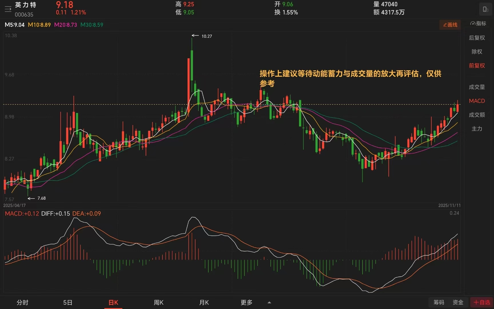 $英 力 特(SZ000635)$ 当前5日线,10日线与20日线呈向上发散状态,并上穿60日线,MACD指标趋好,但成交量趋稳,资金流入较少,且价格回到前期的震荡区间,可能承受回本筹码的压制,操作上建议等待动能蓄力与成交量的放大再评估,仅供参考。