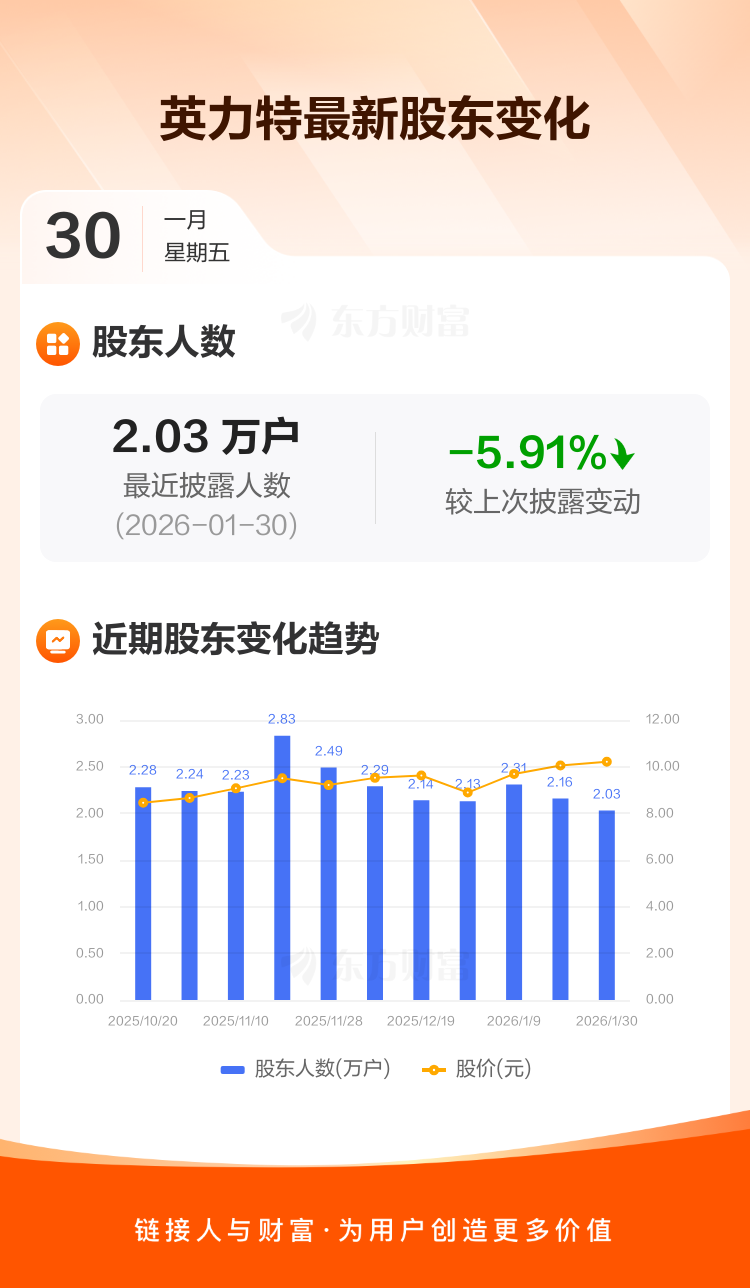英力特最新披露数据显示,截至1月30日公司股东户数为2.03万户,较上期(2026年1月20日)减少1278户,降幅为5.91%。户均持有流通股数量由上期的1.40万股上升至1.49万股,户均持股金额由上期的14.09万元增加至15.21万元。