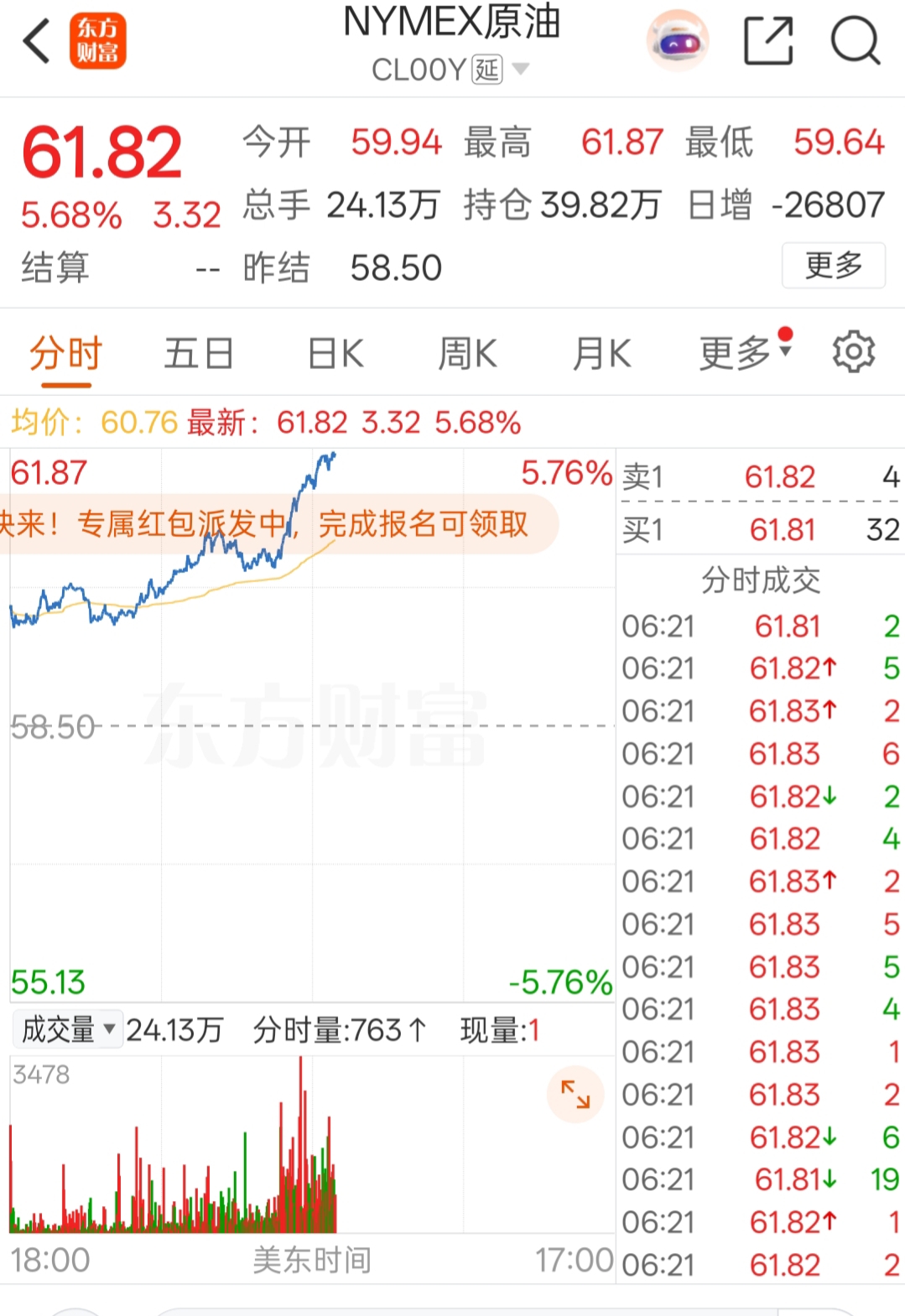 原油,刚刚还3%,已经5%,这是要干嘛,明天石油股票涨停潮吗?