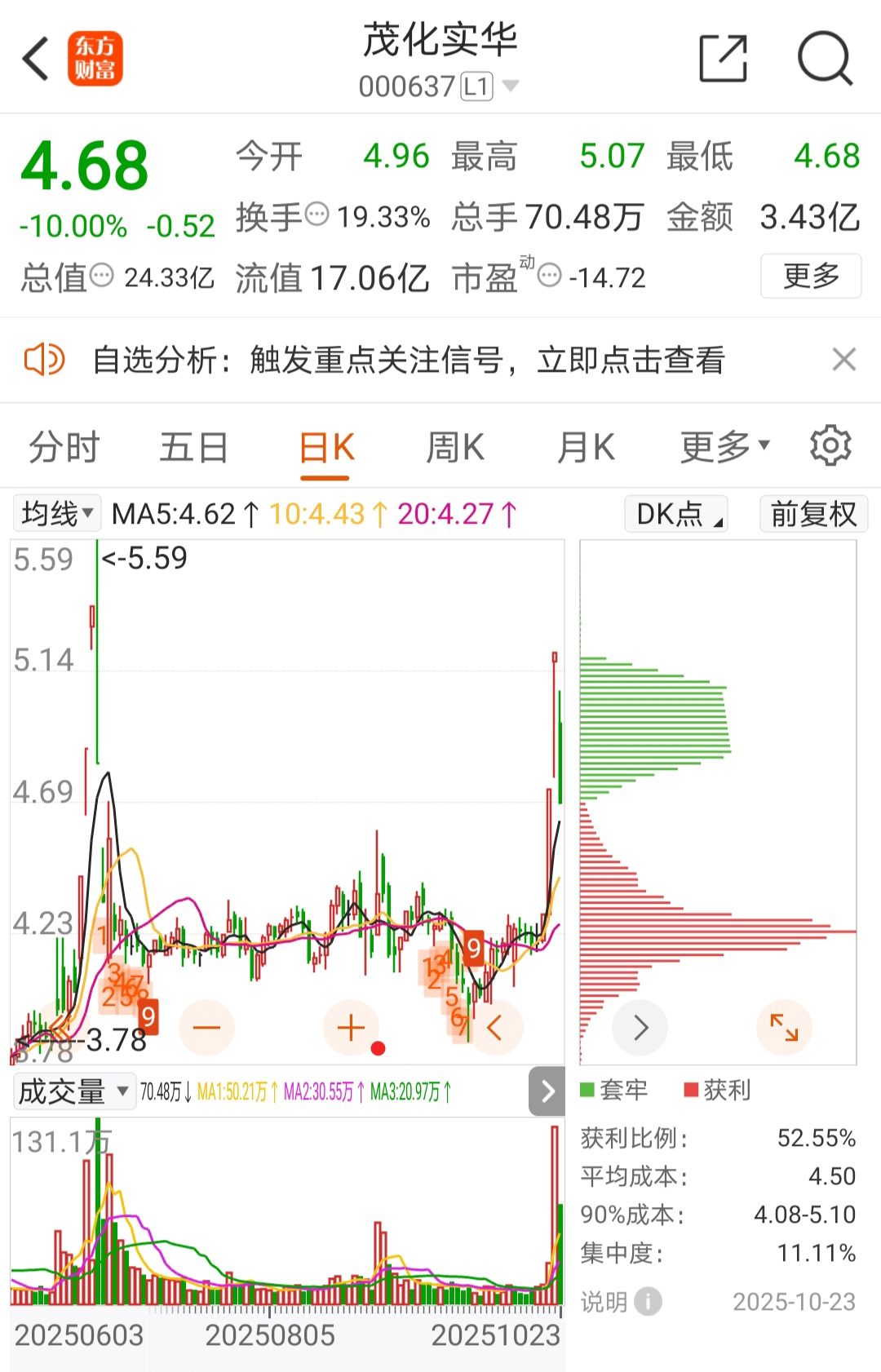 5天4板,几个亿的资金巨量换筹。主力持仓成本估计在4.7元附近,下周应该有个快速脱离持仓成本的要求。
