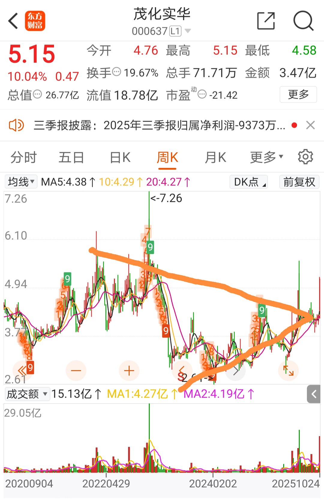 茂名港本周巨量换手突破低位三角形末端5元的中期强阻反压。主力5天4板的资金介入成