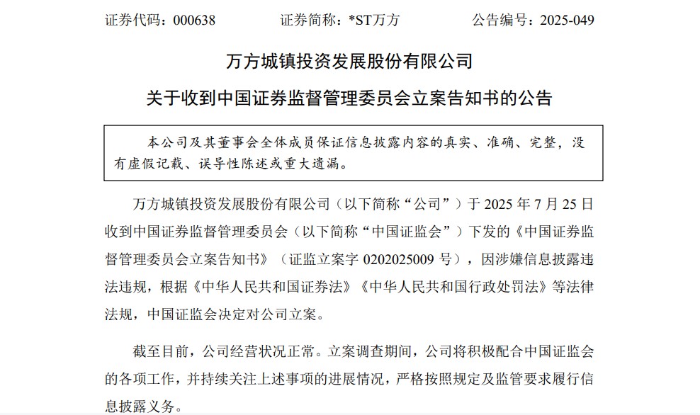 万方发展(000638)索赔登记,7月25日公司收到证监会立案告知书,根据相关司