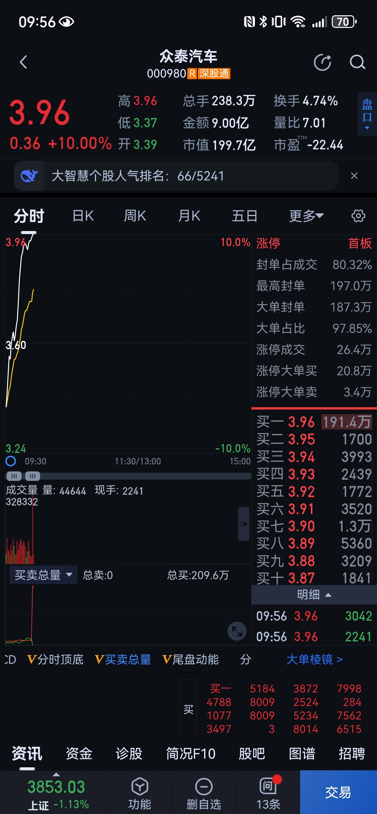 众泰汽车最大股东,九台银行,现在190多万手封死涨停