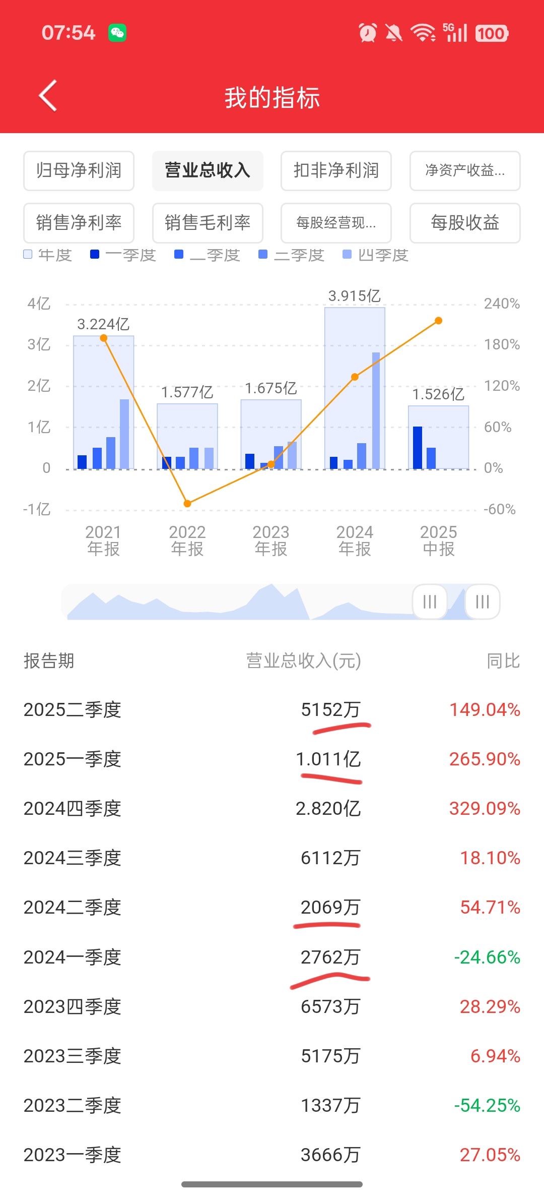 1、2025年中报营收1.5亿,同比去年增长215.85%。