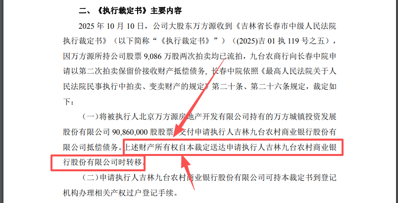 看不懂公告的来,上诉财产所有权【自本裁定】送达九台农行时转移。这说明现在股份已经是九台农行了,板上钉钉的事情了。所以九台农行已经拥有了股权。吉林金控收购九台银行也是走流程了。所以现在万方就是吉林金控的了。看的懂的人根本就不需要等法院流转的公告。