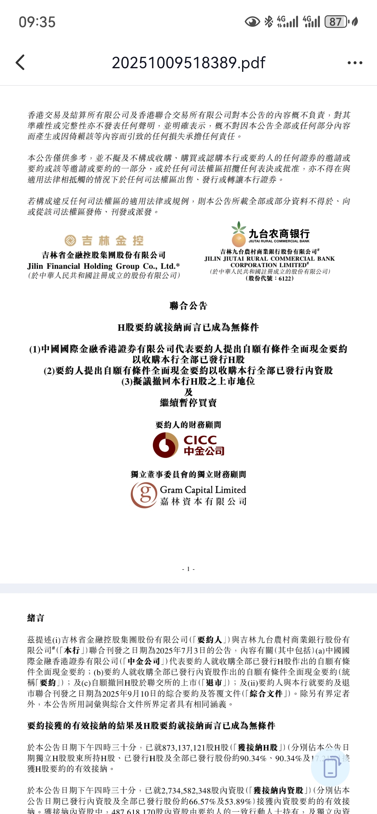 $*ST万方(SZ000638)$ 10月24日吉林金控要约收购九台农商行的股东大会