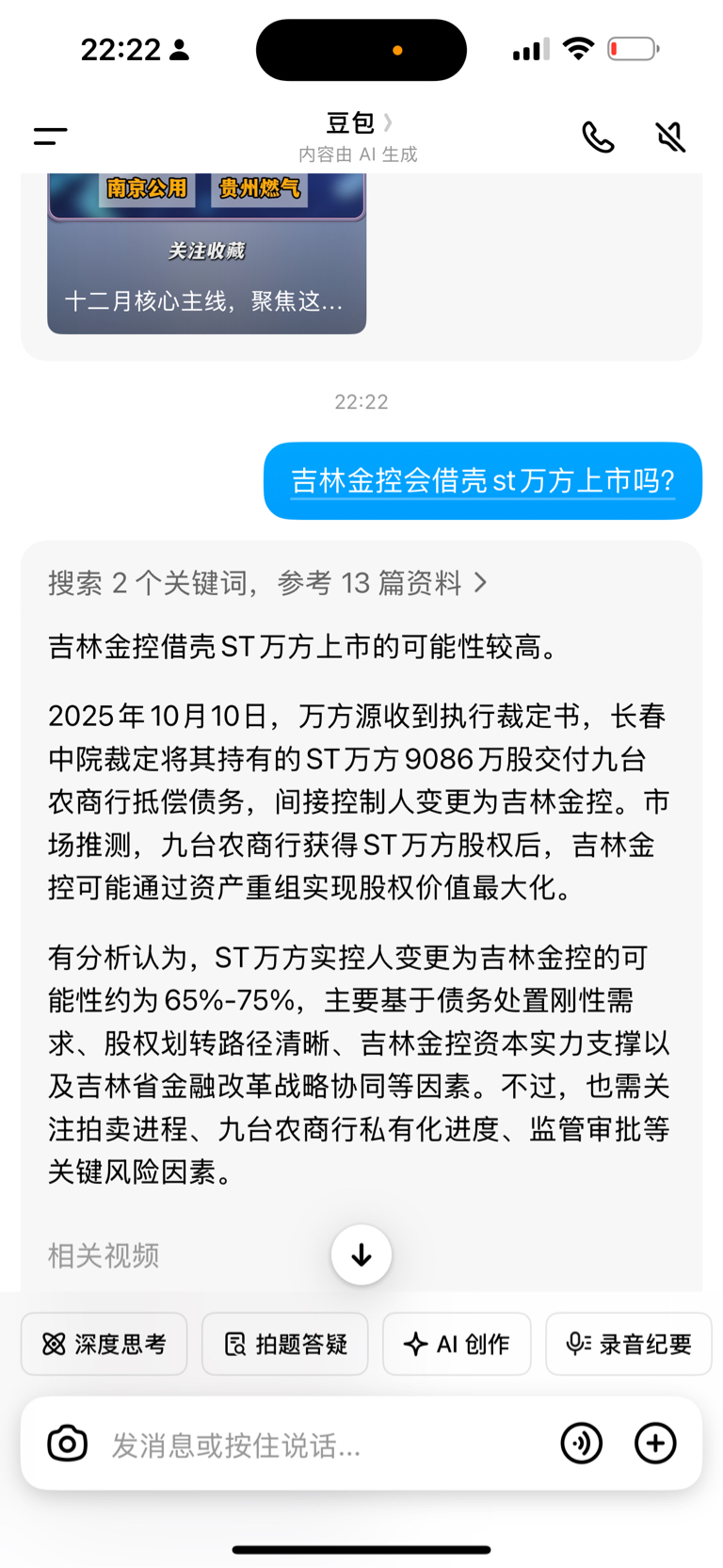 $*ST万方(SZ000638)$ 前面两个交易日两亿成交量一天,今天咋才3000万成交量啊。能不能打开换换手。豆包说吉林金控借壳万方只是有可能,有没有说一定会借壳st万方,大家先卖卖换换手呗。豆包没有说吉林金控一定会借壳万方
