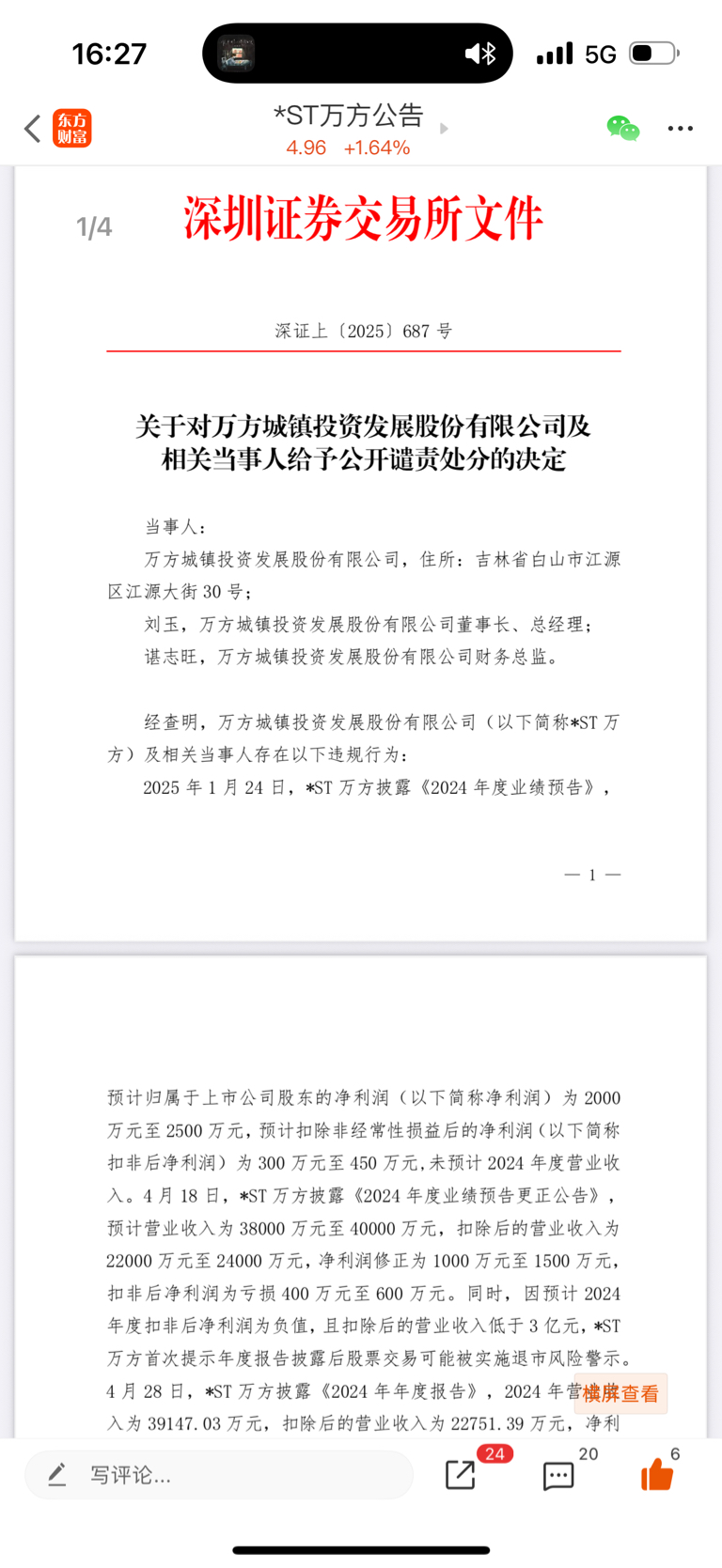$*ST万方(SZ000638)$ 深交所都已经查明了董事长和财务总监给纪律处分克,你村直接罚他们款就得了呗,非要多拉几个多收点钱?搞个大半年