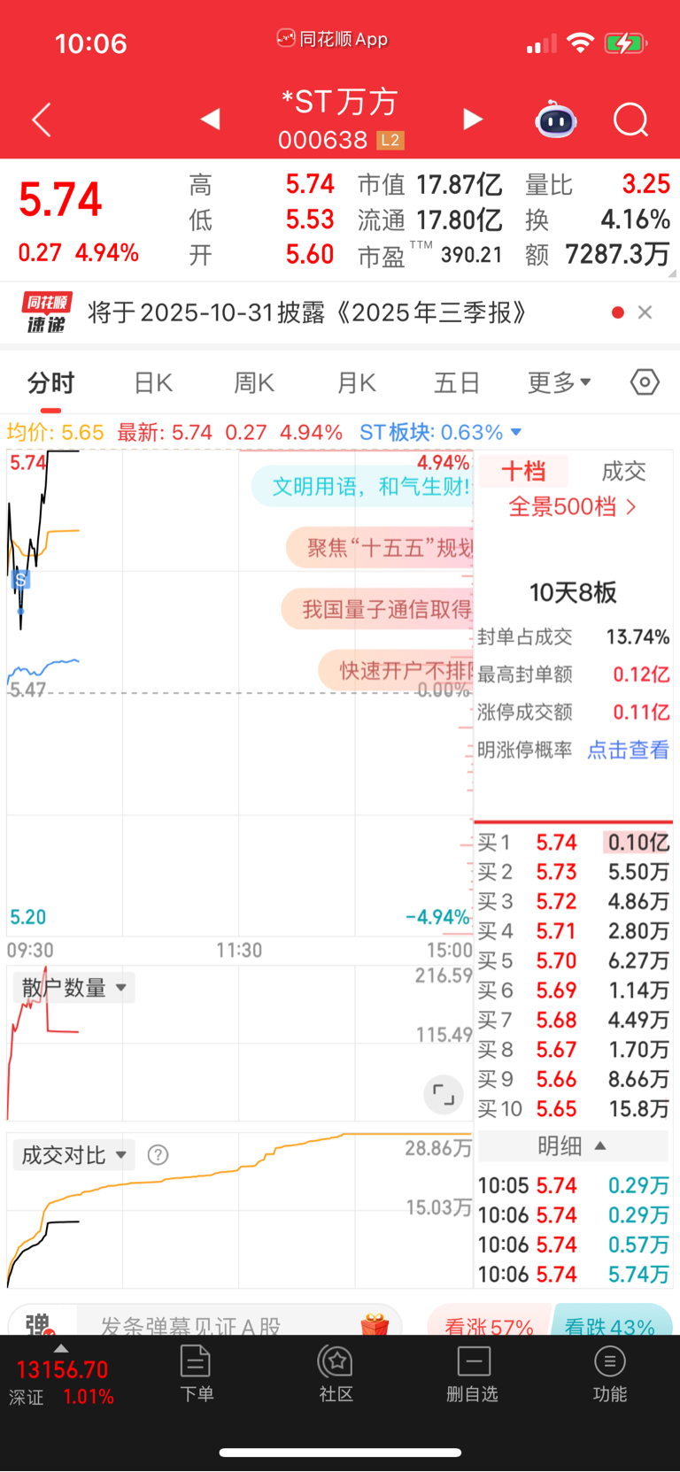 $*ST万方(SZ000638)$ 以后管住手,在这做T结果T飞了,以为开不了板了结果买了亚太,乃乃的直接跌停了。