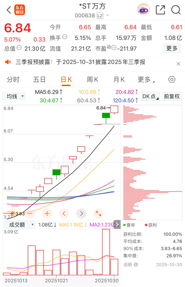 $*ST万方(SZ000638)$ 明天得逃命了,昨天主力假装控异动给它们面子,明天让要买的又以为主力要控它们制定的所谓的异动,先一字板开盘让要买的买不到顶板然后迅速撤单砸盘出货,明天要顶板的考虑清楚了,现在全是获利盘100%主力的成本又低得可怕,敢买公司都卖给你,景峰的一字断魂刀明天又要重现江湖了