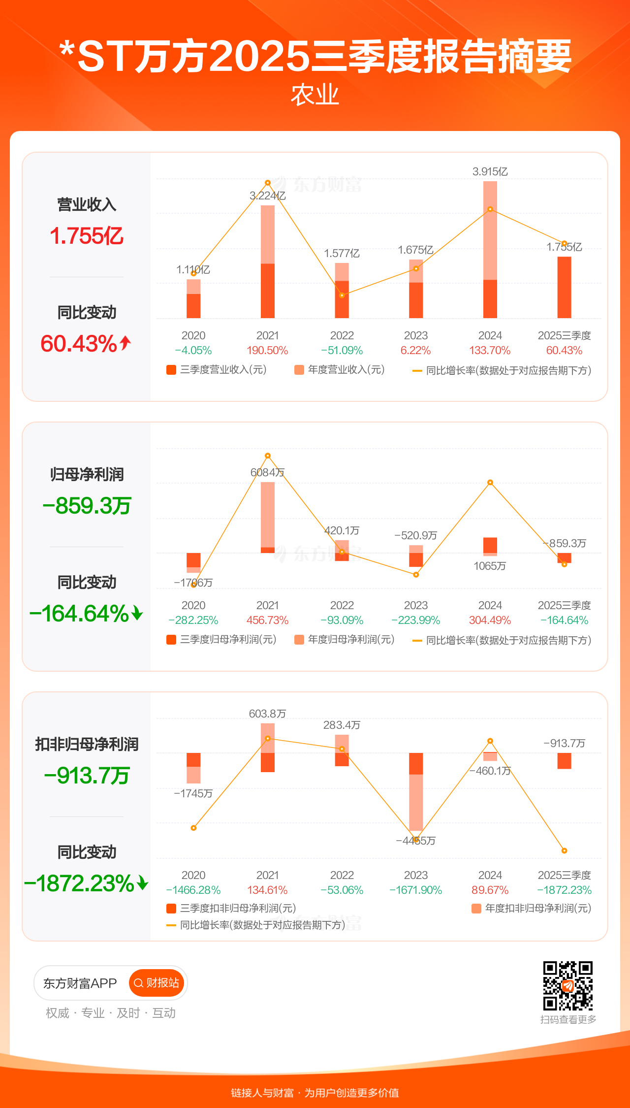 *ST万方10月31日发布2025年三季报显示,公司前三季实现营业收入1.76亿元,同比增长60.43%;归母净利润-859.33万元;扣非归母净利润-913.66万元。