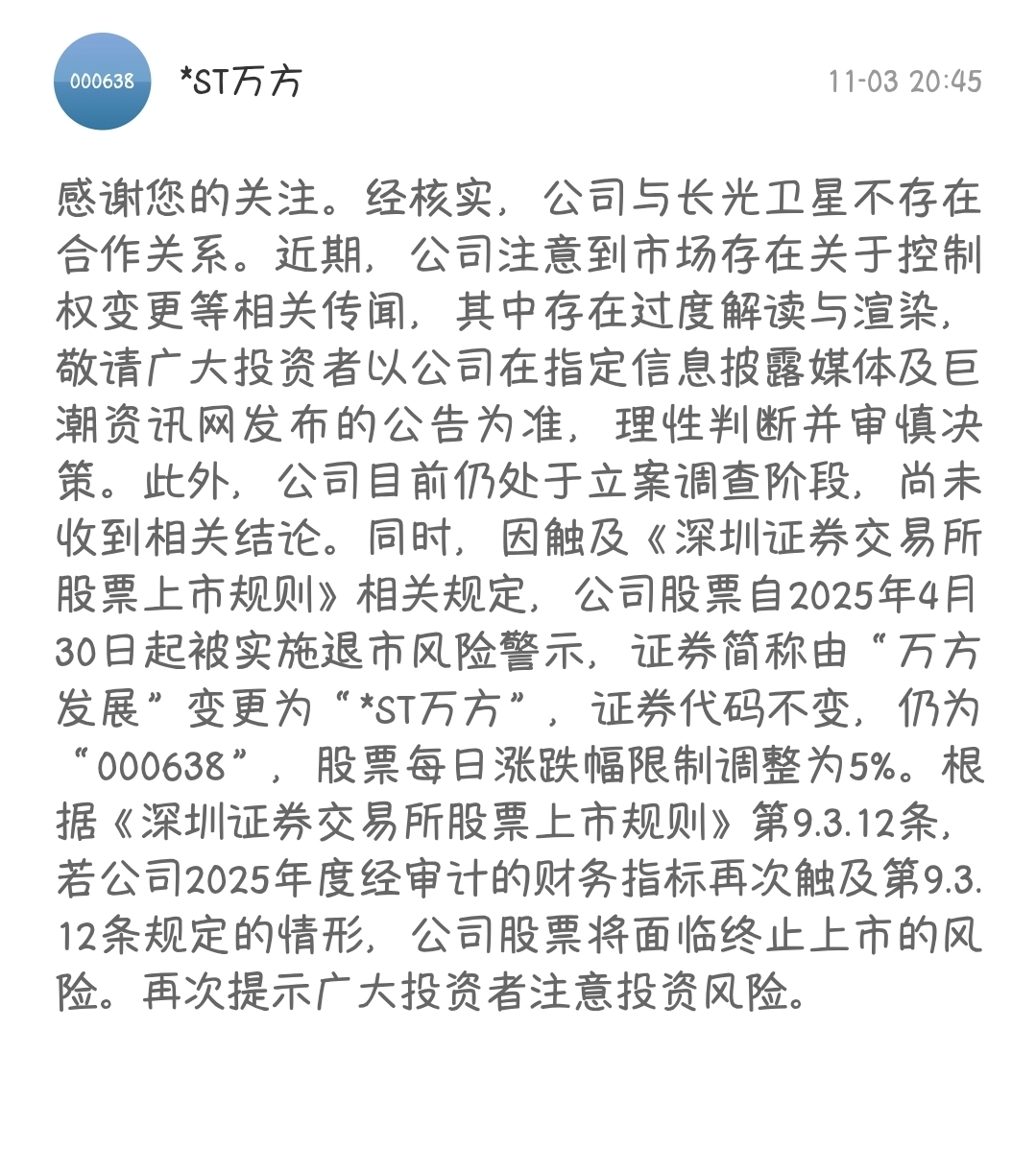 $*ST万方(SZ000638)$ 明天终于要开始调整了吗