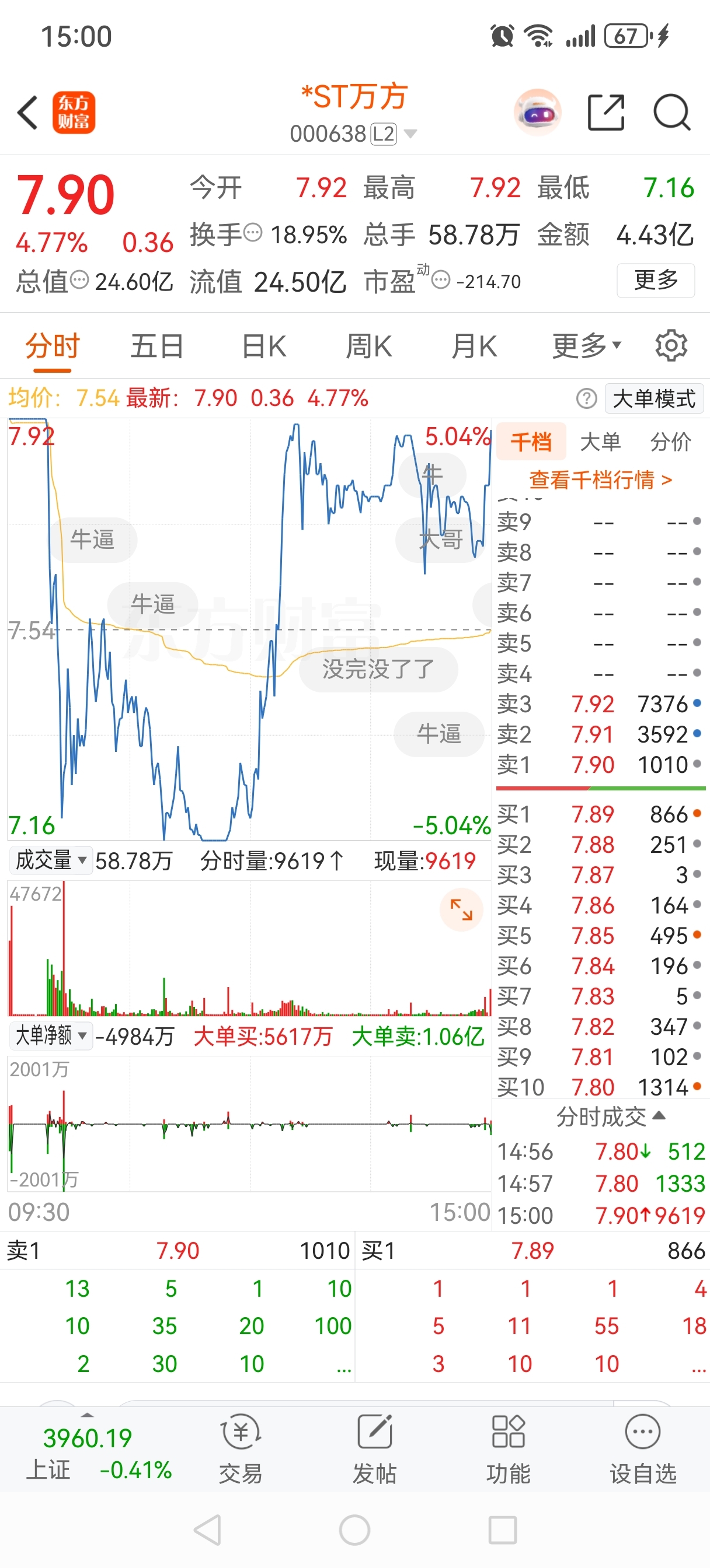 $*ST万方(SZ000638)$ 纪念我人生的第一只天地天的票。大起大落再大起,太刺激了!