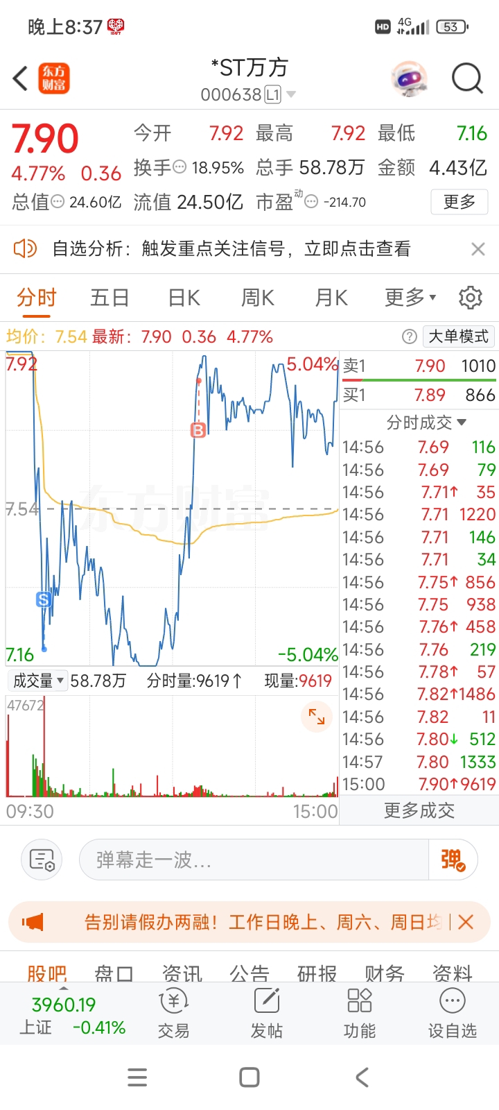 $*ST万方(SZ000638)$ 明天接着买,,,有什么好恐慌的,,看看sT南置的K线图,今天虽天量天价,但是红盘,承接非常强,,不上车留着过年吗