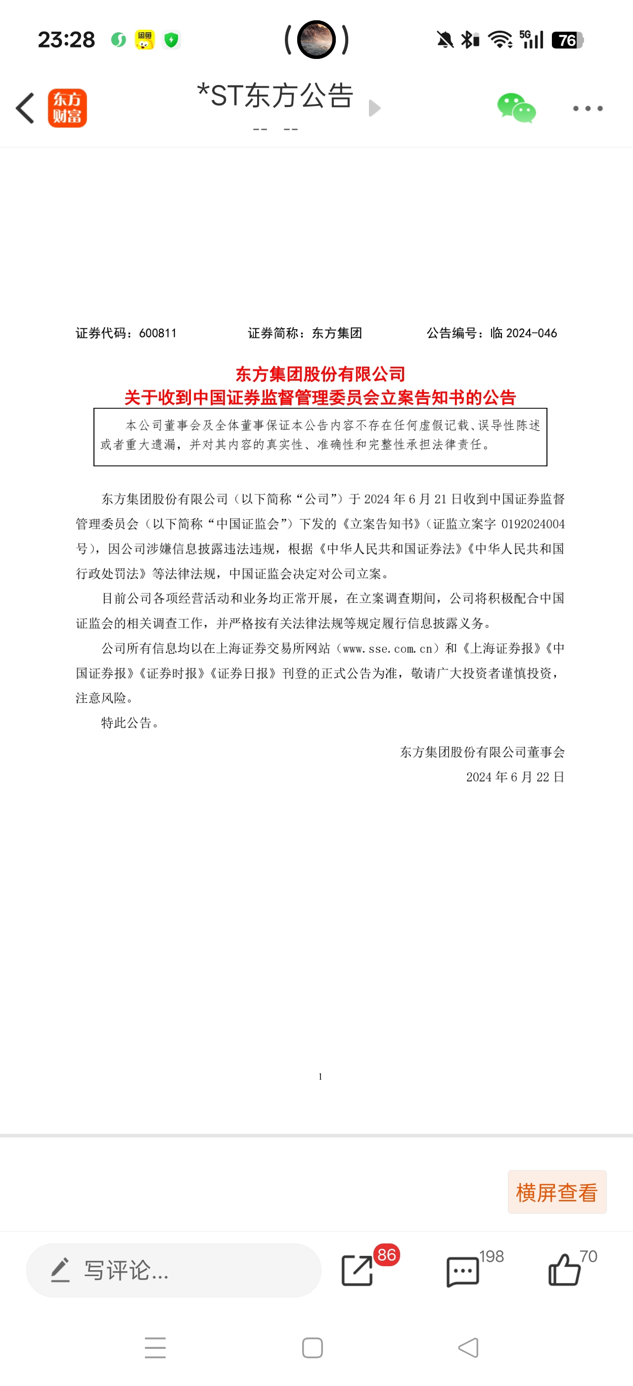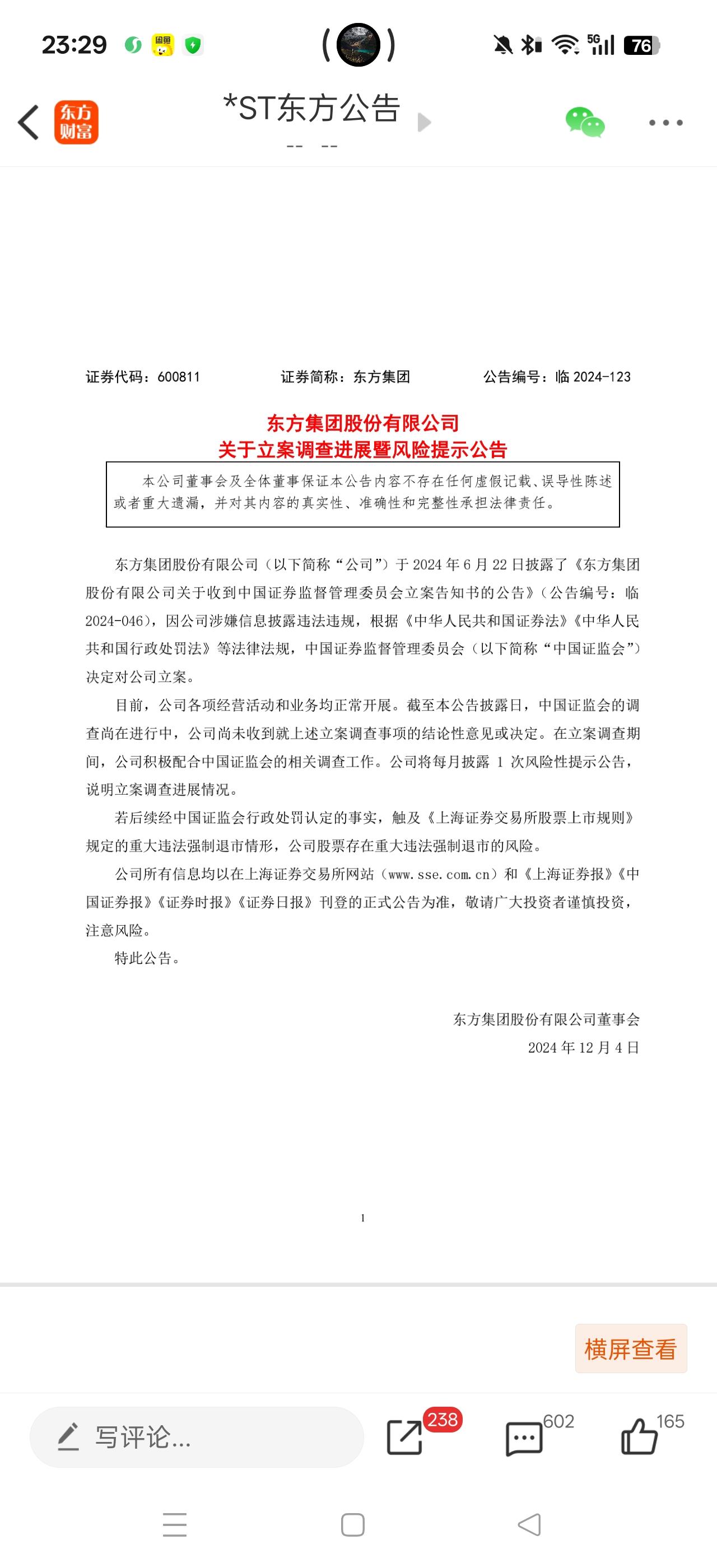 东方集团24.6.22被立案调查,公告里没有提到重大违法退市的内容,而12.4的进展公告里面出现了重大违法退市的内容,最后结局呢?