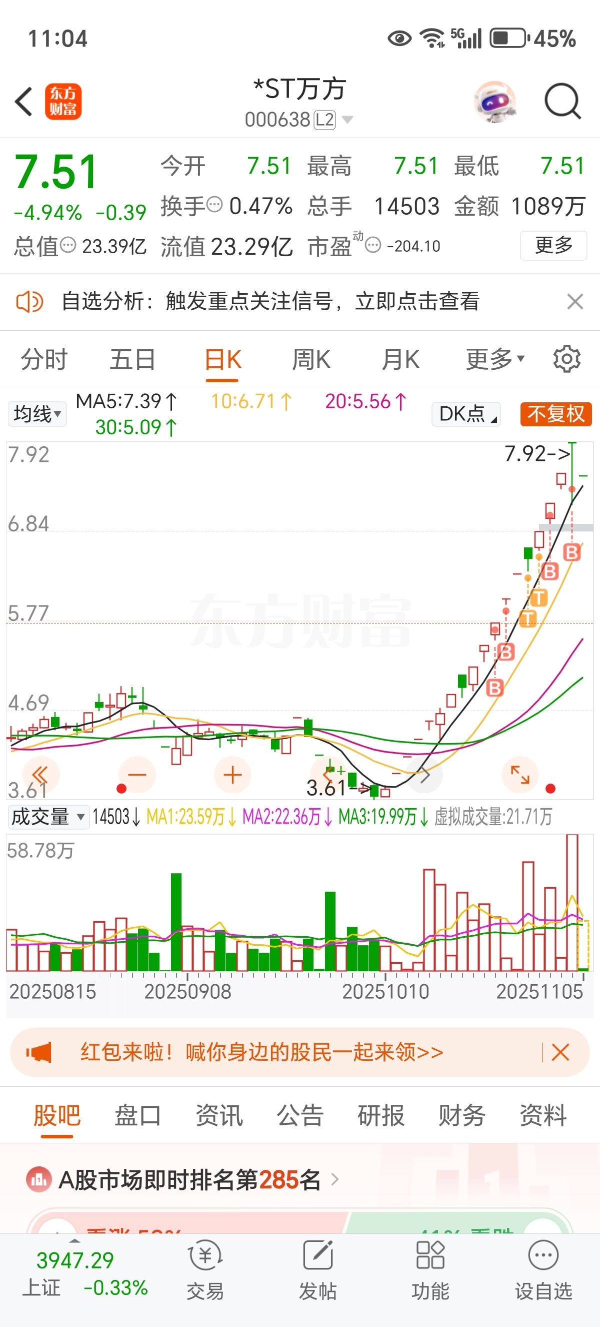 $*ST万方(SZ000638)$ 今天确实是恐慌性抛售,想挂单的就挂吧,股吧的人是真坏,自己手里有什么就猛吹。多的不说了,万方明天应该还有一个跌停,参考正平。今天那个5000手大单不撤大家都出不去,挂单意义不大。还有我自己是有票而不是无脑吹