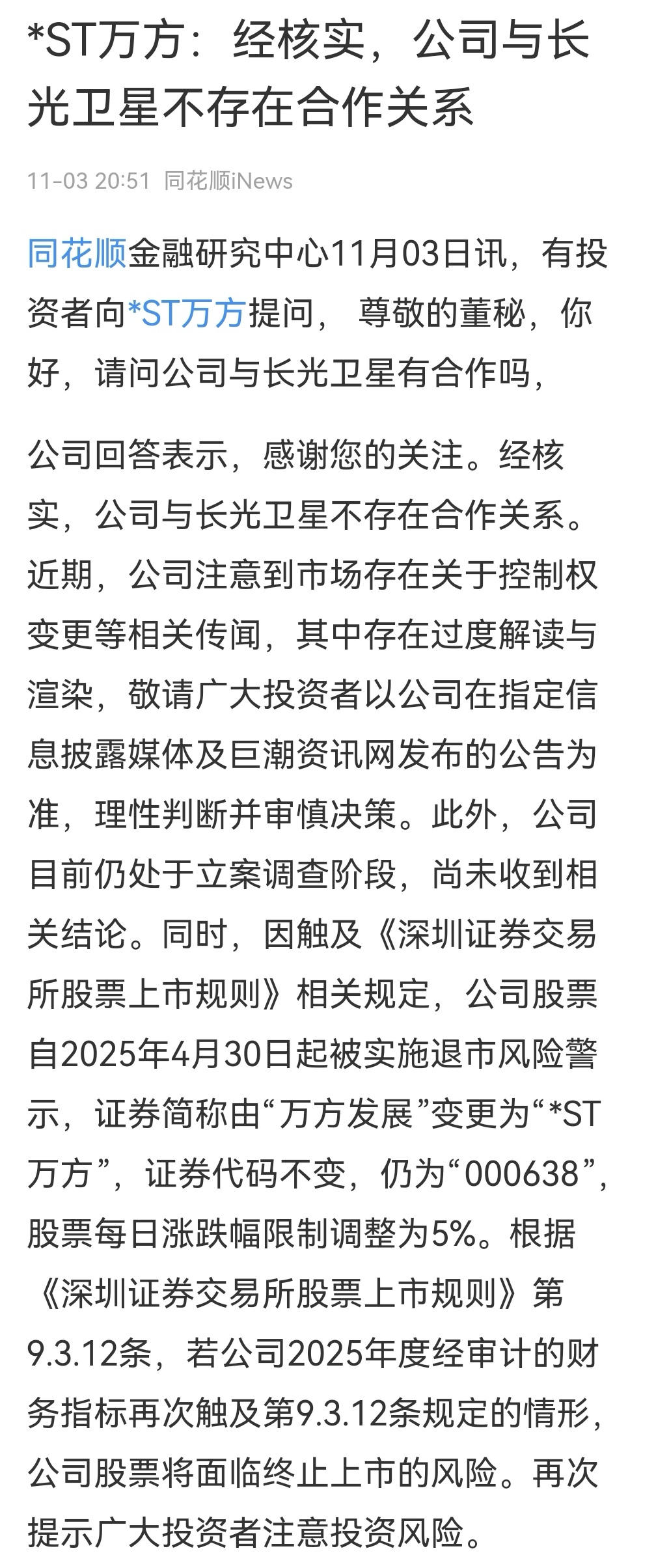 $*ST万方(SZ000638)$ 随着今晚官方公告最大预期利空降临!最终如我最近分析一致,今日晚些st万方最大利空已公告,一场暴风雨明天开盘将如期而至,股价随着前几日最大预期被否(所谓长光借壳相关主力请唱多者发布的一些小作文),随着预期被否,st万方目前价格虚高已成事实,明日市场将发起猛烈出货,回归4元以内;