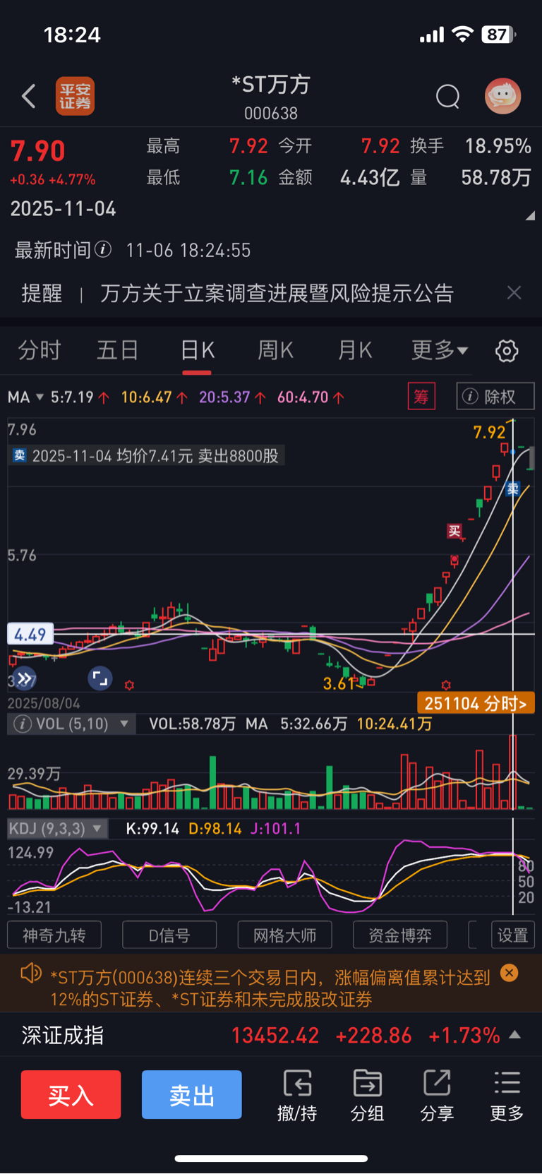 $*ST万方(SZ000638)$ 虽然没跑到最高点,但目前看来走的太及时了