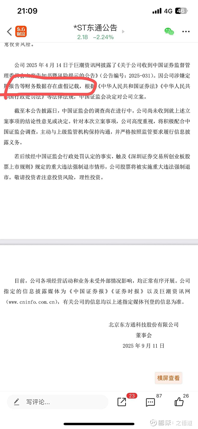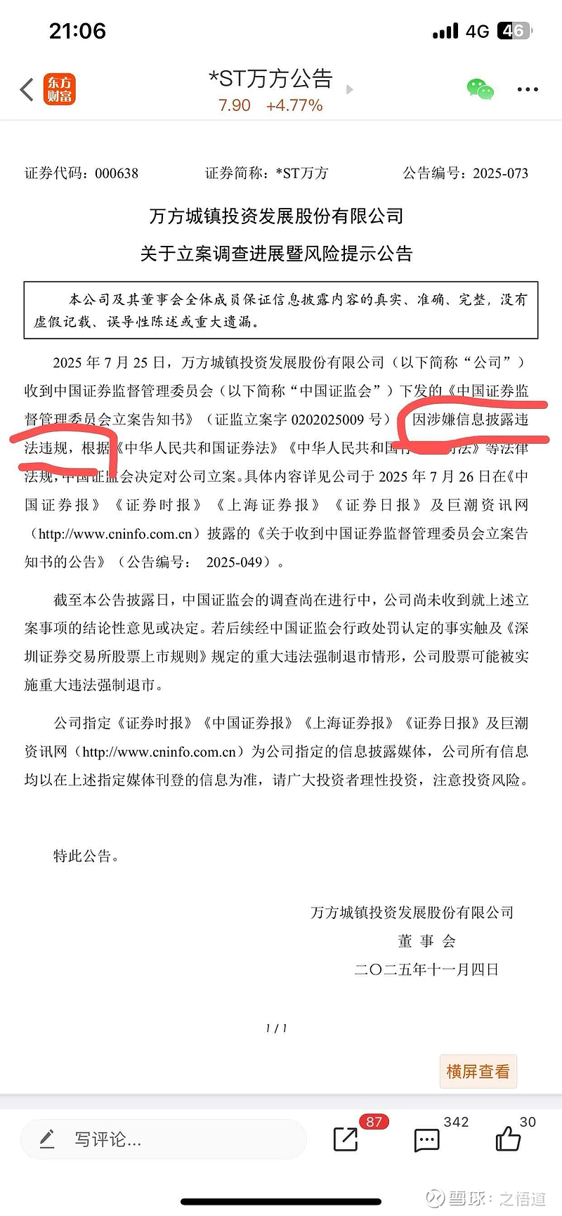 披违规,再违规也不会退市的,3.6元的时候我就说过了啊,和元成 东通的财务作假立案本来就是两码事。 而且信披违规都是吉林省证监局调查,它能查的吉林财政厅旗下的万方退市吗?[[大笑]] 炒st股首先要完全搞懂规则啊,同志们[[赞成]]