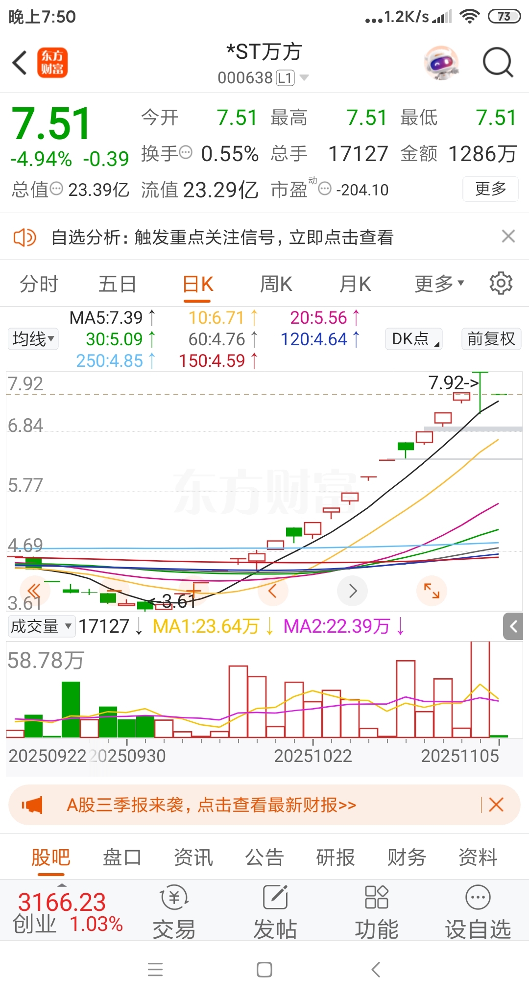 2025年底了,我今年炒股票也告一段落,知道天道炒股票不酬勤,只厚报看好公司未来而执着长线持股的,长线持股前提必须这个股票方向好风险小。今年作股票,严格执行公司未来方向判断,我对ST股票情有独钟,去年发表作品说操作的*ST摩登,*ST亚取*ST山东墨龙 *ST恒久今年表现很好,今年选择*ST阳光,成本1.88,这个股票判断问题不大,继续持股,选择买入2.19买入*ST新动力,发现大幅度拉升出货,在3.1出逃,果然给立案了,选择买入*ST春天4.41,理论操作可以赚钱,事实低位割肉4.10割肉换股凯瑞德,虽然这些操作是同样在拉高出货的海昌新材31.6出逃赚钱后买入的,看看拉高出货的海昌新材现在股价22之下,拉高出货是一种常见的庄家操作方法,今年半年前曾经说3.10的*ST万方可以放心买,还下跌3左右之下,当时要多少有多少*ST万方,我一直关注这个股票,上周还说它股权转让还会涨停板,但是没有说能买入,现在拉高出货昨天放量流通盘的四分之一五千多万股庄家出逃很成功,判断原则股价的在高位第一个跳空下跌形成,昨天就是拉高出货成立,操作方向就是今天跌停板开始后面就要在任何还是获利盘的位置出逃,盘中反弹出逃离开,不要抱任何幻想在后面股价还会创新高,这是不可能的,之所以这样说,这是技术指标决定风险方向,*ST万方今天跳空下跌跌停板就是后面没戏了,就算后面股权转让公告出来,反弹也是出货持股的出逃,就这么简单,反过来说凯瑞德股权转让,如果公告出来,就不是出货而是持股,因为下一步就是可能以后任何时候就有重组可能,说的平台重心在我投入80000元买入10400股还剩下不到一百股资金上,成本摆明就在7.68这里,现在已经套牢,只能耐心等待,下跌也没办法,因为买入是看好公司明年以后方向向好,就是公司可能的重组方向。