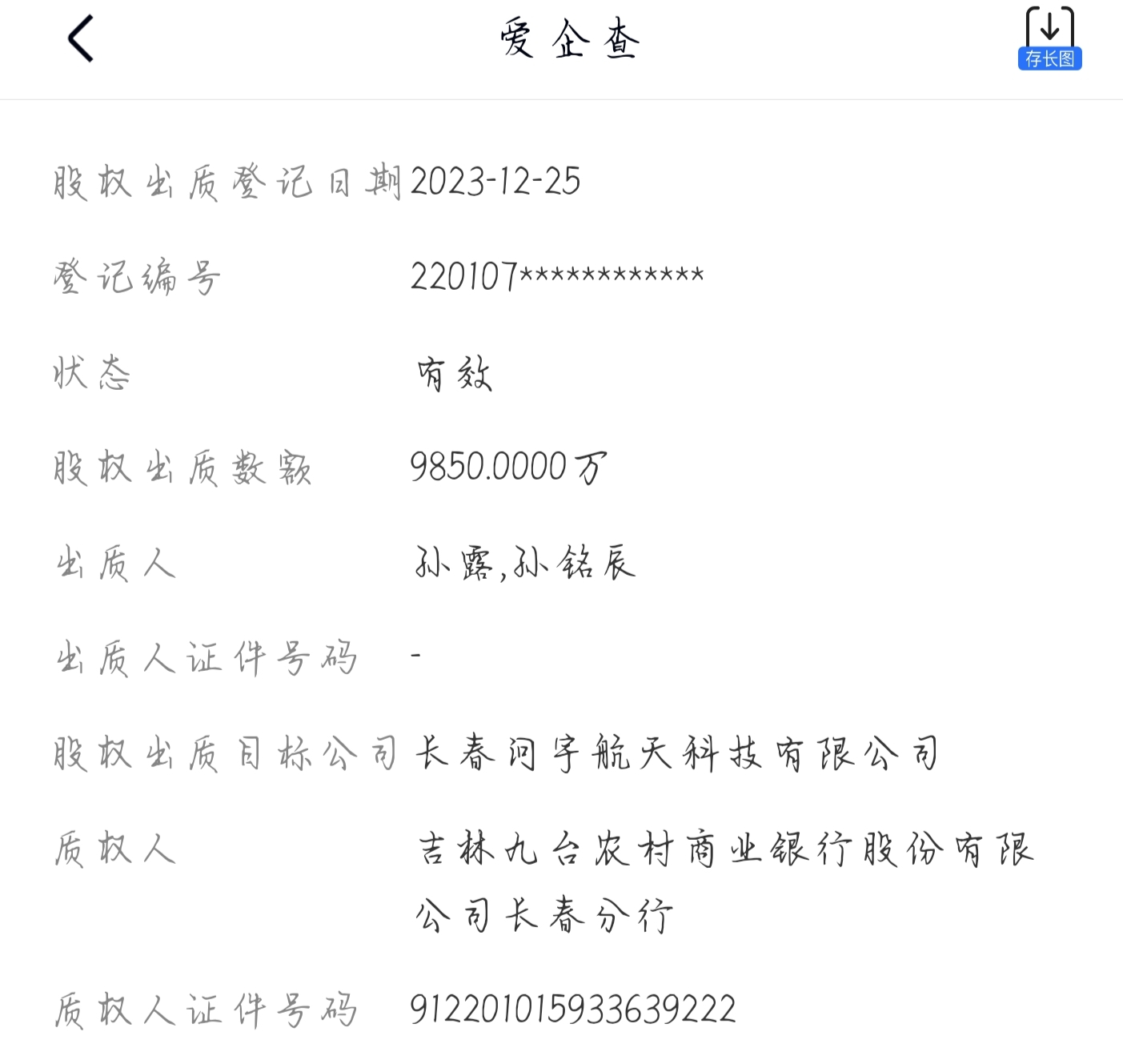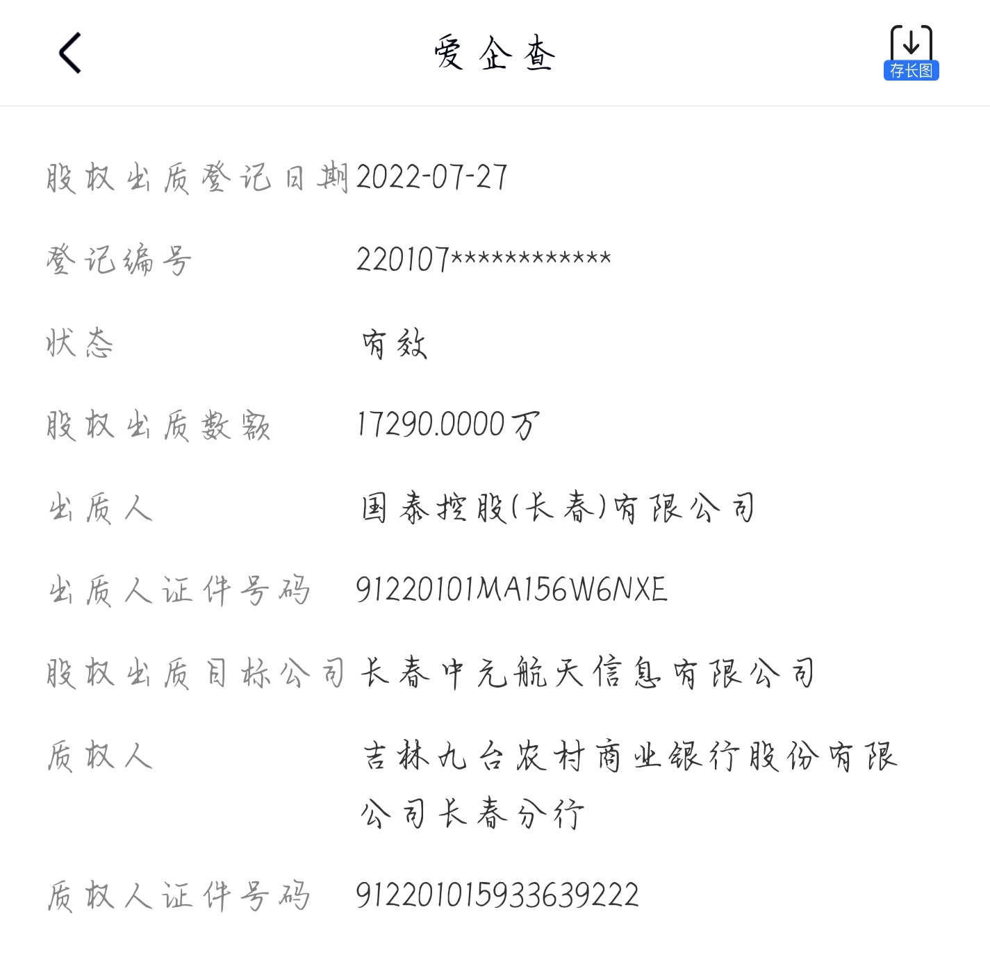刚回来一看,那个帖子被吃了,无语了。这是长光卫星第三第四股东股权质押给九台农商银