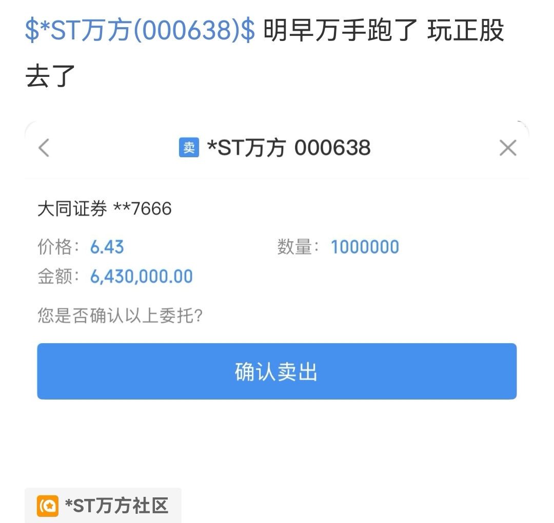 $*ST万方(SZ000638)$ 雪球大户明天要砸盘了,大家提前挂跌停,别让他跑了