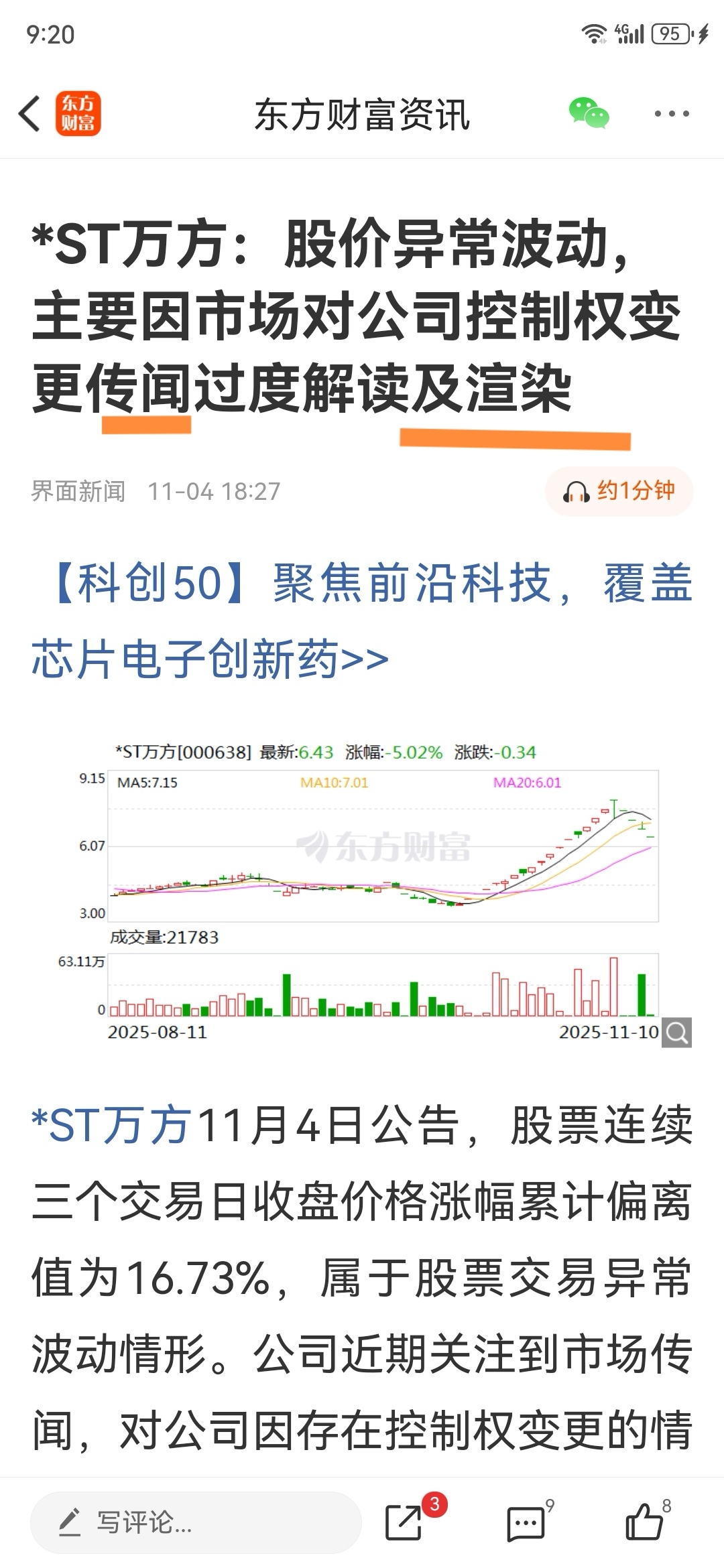$*ST万方(SZ000638)$ 董秘请把这公告也更正一下,去掉传闻和及渲染五个字,因为控制权变更是板上钉钉的事实怎么说是传闻呢,过度解读(猜测臆想长光卫星借壳)还说的过去怎么说是渲染呢。