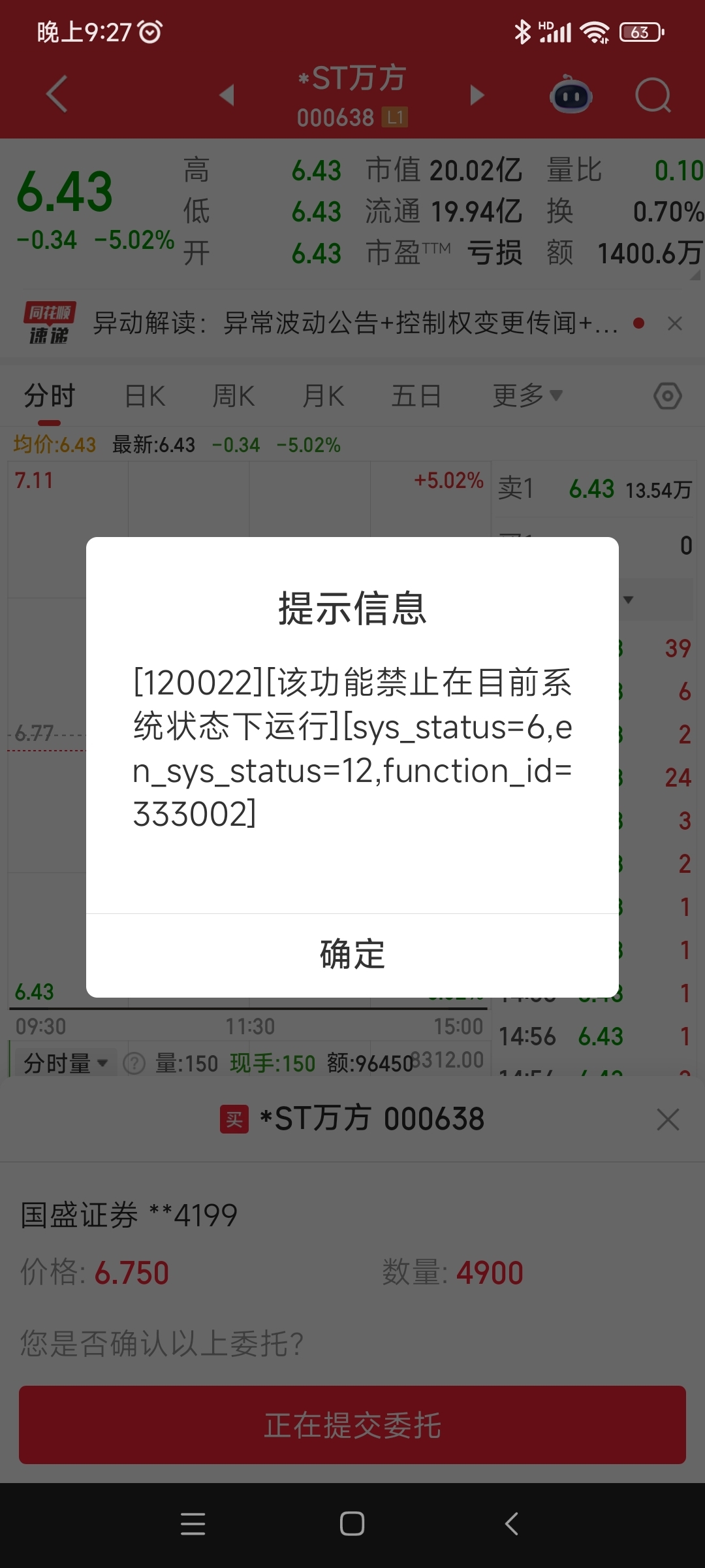 $*ST万方(SZ000638)$ 刚看到董秘发的不涉及重大违法,马上挂涨停买入,怎么9点半了还挂不了单。 $ST中迪(SZ000609)$ $ST新华锦(SH600735)$