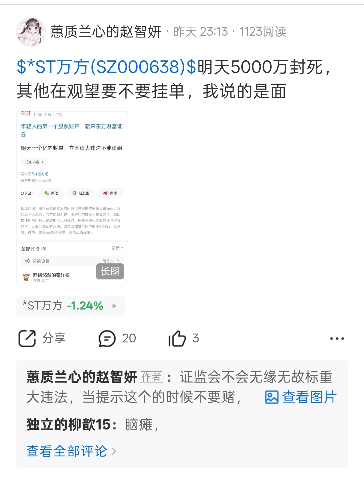 温馨提示: 1.根据《证券法》规定,禁止编造、传播虚假信息或者误导性信息,扰乱证券市场;2.用户在本社区发表的所有资料、言论等仅代表个人观点,与本网站立场无关,不对您构成任何投资建议。用户应基于自己的独立判断,自行决定证券投资并承担相应风险。《东方财富社区管理规定》