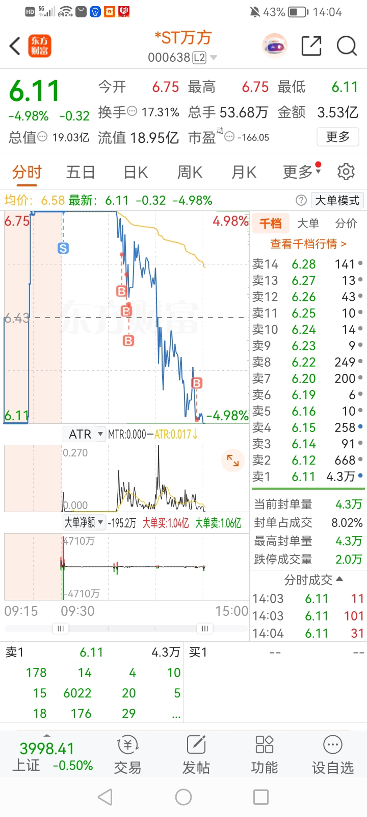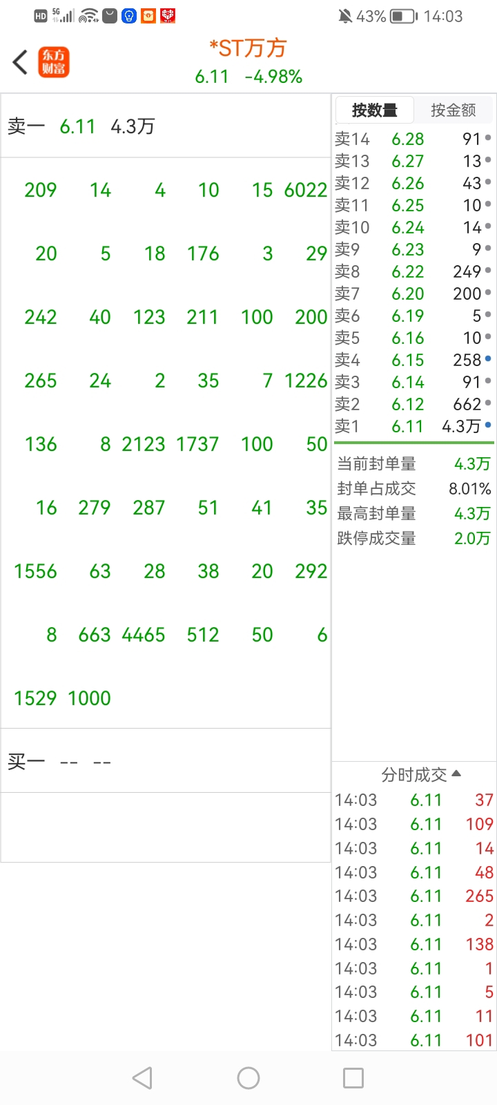 6.11还想买,可惜没钱了,万方都五个跌停板了,明天应该不会一字跌停板吧,庄真狠